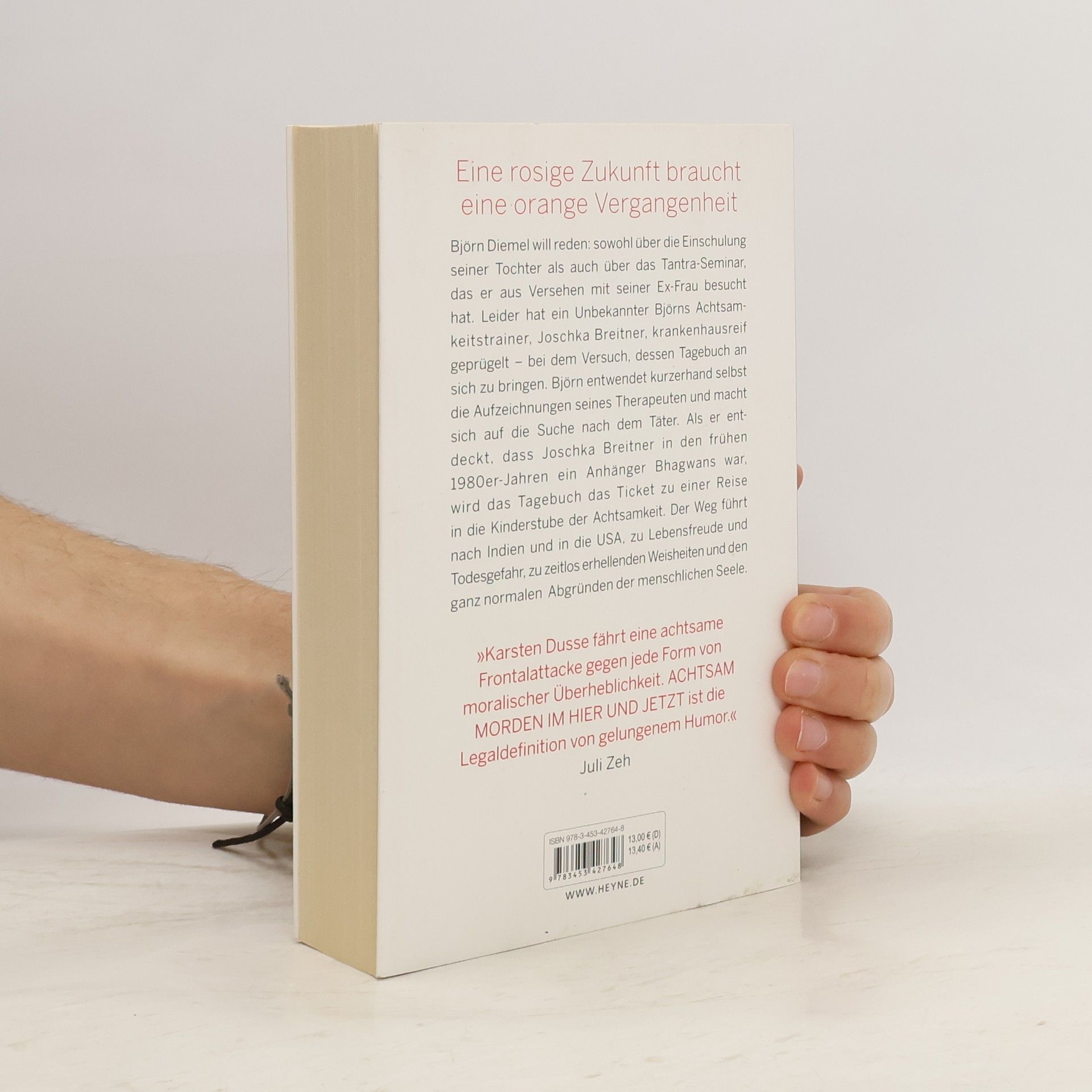 Wenn die Vergangenheit deines Therapeuten deiner Zukunft im Weg steht, ist es Zeit, im Hier und Jetzt zu leben Björn Diemel will reden: sowohl über die Einschulung seiner Tochter als auch über das Tantra-Seminar, das er aus Versehen mit seiner Ex-Frau besucht hat. Leider hat ein Unbekannter Björns Achtsamkeitstrainer, Joschka Breitner, krankenhausreif geprügelt – bei dem Versuch, dessen Tagebuch an sich zu bringen. Björn entwendet kurzerhand selbst die Aufzeichnungen seines Therapeuten und macht sich auf die Suche nach dem Täter. Als er entdeckt, dass Joschka Breitner in den frühen 1980er Jahren ein Anhänger Bhagwans war, wird das Tagebuch das Ticket zu einer Reise in die Kinderstube der Achtsamkeit. Der Weg führt nach Indien und in die USA, zu Lebensfreude und Todesgefahr, zu zeitlos erhellenden Weisheiten und den ganz normalen Abgründen der menschlichen Seele.