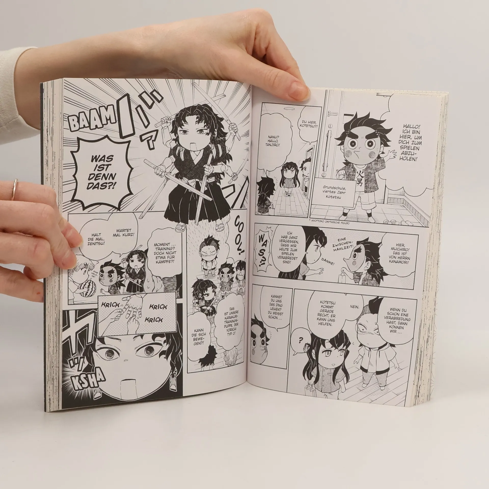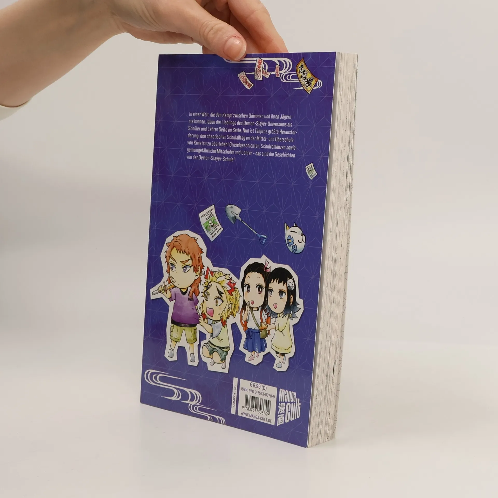 Die Welt ist friedlich, die Dämonenjäger sind von ihren Pflichten befreit … und Tanjiros größte Herausforderung ist es, den chaotischen Schulalltag an der Mittel- und Oberschule von Kimetsu zu überleben! Gruselgeschichten, Schulromanzen sowie gemeingefährliche Mitschüler und Lehrer – das sind die Geschichten von der Demon-Slayer-Schule!