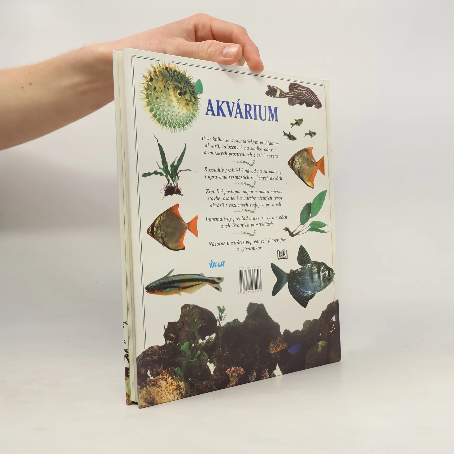 Praktický návod na zariadenie, osadenie a údržbu sladkovodných a morských akvárií. Kapitoly: Prirodzené prostredia-Voda, Sladkovodné prostredia, Brakické prostredia, Morské prostredia, Vplyv človeka. Ryby-Pôvod rýb, Stavba rybieho tela. Sladkovodné akvárium-Zariaďovanie akvária, Sladkovodné spoločenské akvárium, Rieka amazonského pralesa, Amazonské kyslé jazierko, Bystrina rieky Zaire, Zdrže juhovýchodnej Ázie, Rieka v juhovýchodnej Ázii, Piesčitá rieka Novej Guiney, Stredoamerické skalnaté jazero, Východoafrické skalnaté jazero, Západoafrický záplavový močiar. Brakické akvárium-Stredoamerický príbrežný tok, Východoafrické mangrove, Ústie v juhovýchodnej Ázii. Morské akvárium-Morské spoločenské akvárium, Havajský koralový útes, Britské skaliská. Úprava vody a údržba nádrže-Úprava chemizmu vody, Filtrovanie v akváriu, Ohrievanie a osvetlenie, Akváriové rastliny, Predchádzanie nehodám. Kŕmenie, rozmožovanie a starostlivosť o zdravie-Kŕmenie, rozmonožovanie, starostlivosť o zdravie.