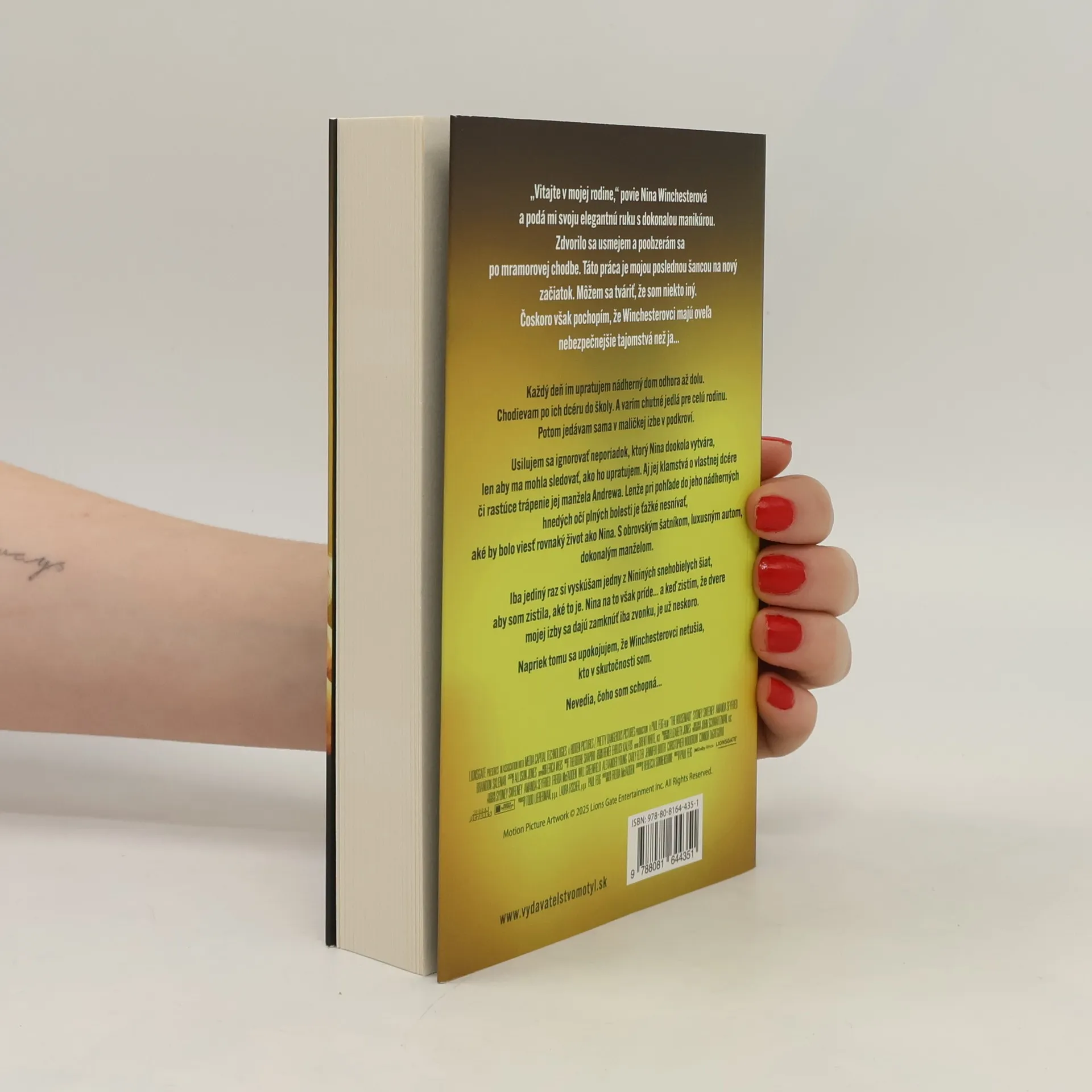 "Vitajte v mojej rodine," povie Nina Winchesterová a podá mi svoju elegantnú ruku s dokonalou manikúrou. Zdvorilo sa usmejem a poobzerám sa po mramorovej chodbe. Táto práca je mojou poslednou šancou na nový začiatok. Môžem sa tváriť, že som niekto iný. Čoskoro však pochopím, že Winchesterovci majú oveľa nebezpečnejšie tajomstvá než ja... Každý deň im upratujem nádherný dom odhora až dolu. Chodievam po ich dcéru do školy. A varím chutné jedlá pre celú rodinu. Potom jedávam sama v maličkej izbe v podkroví. Usilujem sa ignorovať neporiadok, ktorý Nina dookola vytvára, len aby ma mohla sledovať, ako ho upratujem. Aj jej klamstvá o vlastnej dcére či rastúce trápenie jej manžela Andrewa. Lenže pri pohľade do jeho nádherných hnedých očí plných bolesti je ťažké nesnívať, aké by bolo viesť rovnaký život ako Nina. S obrovským šatníkom, luxusným autom, dokonalým manželom. Iba jediný raz si vyskúšam jedny z Nininých snehobielych šiat, aby som zistila, aké to je. Nina na to však príde...a keď zistím, že dvere mojej izby sa dajú zamknúť iba zvonku, je už neskoro. Napriek tomu sa upokojujem, že Winchesterovci netušia, kto v skutočnosti som. Nevedia, čoho som schopná...