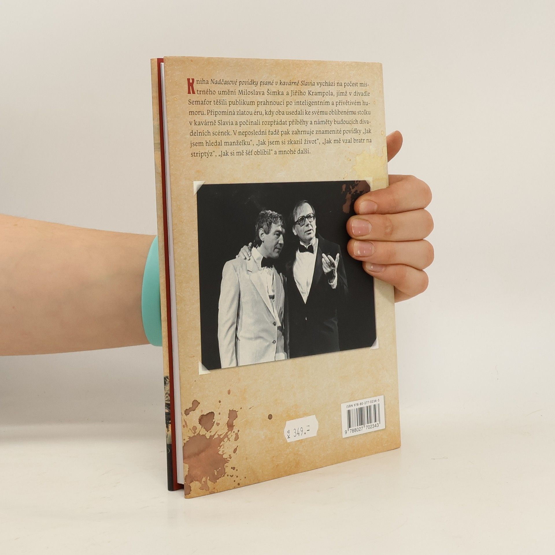 Divadlo Semafor vzniklo roku 1959 a za celou svoji historii pojalo nespočet významných osobností českého kulturního života: Jiřího Šlitra, Jiřího Grossmanna, Miloslava Šimka, Waldemara Matušku, Miroslava Horníčka, Evu Pilarovou, Karla Gotta, Miloše Kopeckého, Františka Filipovského, Karla Černocha, Ladislava Štaidla, Jiřího Krampola, Josefa Dvořáka anebo legendárního režiséra Jána Roháče. Herců bylo mnoho, her také – a kdo by byl tušil, že třeba Kytice se bude reprízovat až šestsetkrát? Kniha Nadčasové povídky psané v kavárně Slavia vychází na počest mistrného umění Miloslava Šimka a Jiřího Krampola, jímž v divadle Semafor těšili publikum prahnoucí po inteligentním a přívětivém humoru. Připomíná zlatou éru, kdy oba usedali ke svému oblíbenému stolku v kavárně Slavia a počínali rozpřádat příběhy a náměty budoucích divadelních scének. V neposlední řadě pak zahrnuje znamenité povídky „Jak jsem hledal manželku“, „Jak jsem si zkazil život“, „Jednou jsi dole, jednou nahoře“, „Jak mě vzal bratr na striptýz“, „Jak si mě šéf oblíbil“ a mnohé další.