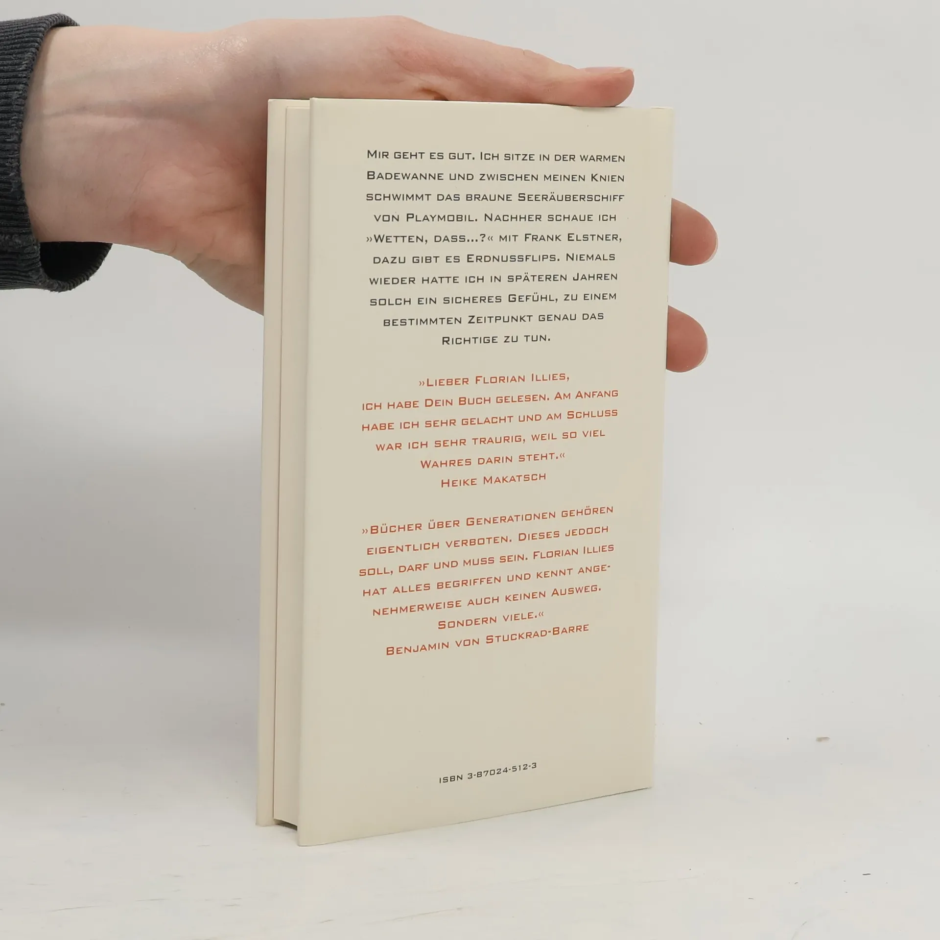 Mir geht es gut. Ich sitze in der warmen Badewanne, und zwischen meinen Knien schwimmt das braune Seeräuberschiff von Playmobil. Nachher schaue ich »Wetten, dass...?« mit Frank Elstner, dazu gibt es Erdnussflips. Niemals wieder hatte ich in späteren Jahren solch ein sicheres Gefühl, zu einem bestimmten Zeitpunkt genau das Richtige zu tun.