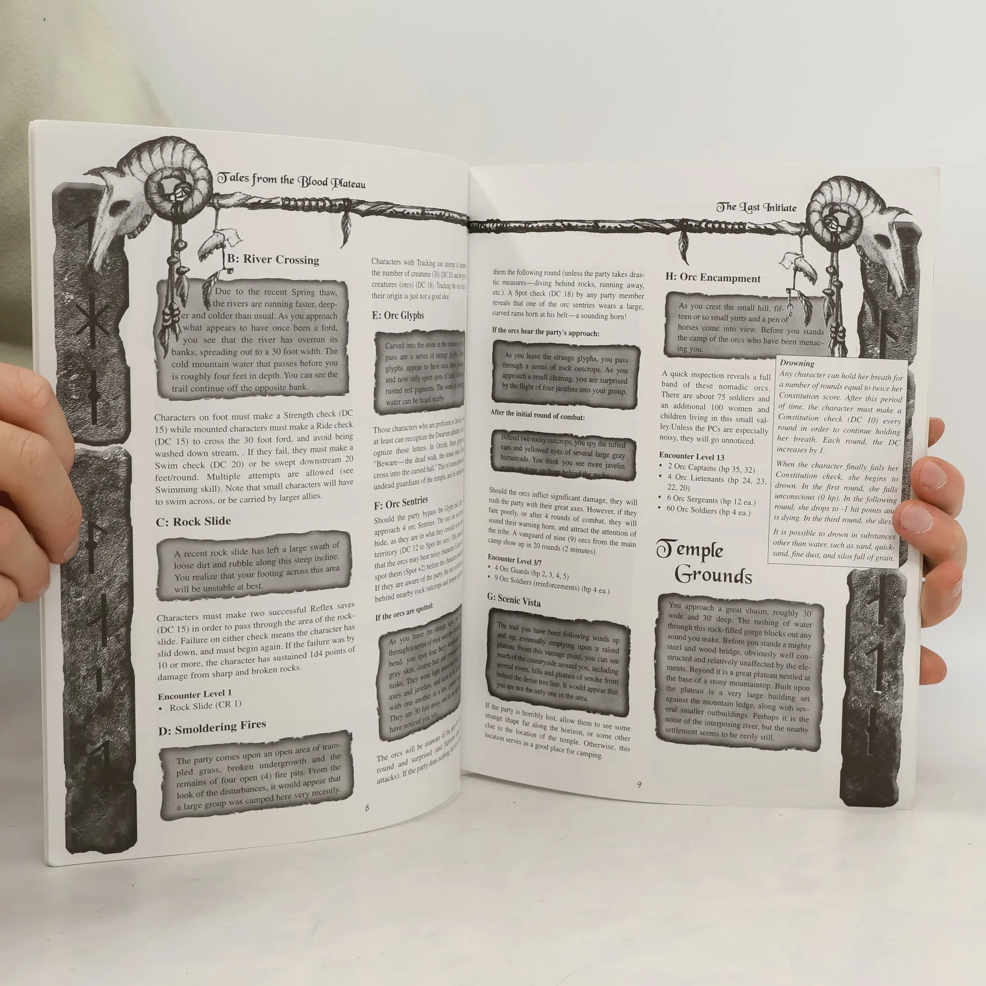 The skeletal body you found in the wilds carried a plea for help - a plea that was never delivered. Whoever he was, his failure left his entire brotherhood under siege by a barbarous army of Orcs. Did the priests and their followers survive the attack, to still live hidden somewhere in the wilderness? While the dead man you found doesn't talk, his weathered note bares a map to the secret temple's location. But the note also speaks of treasures; Wonders he calls them, that must be saved at all cost. Perhaps a trip to this temple might be in order. After all, the clerics may still need some help. Or, more likely, there could be treasures left for the taking. And with no civilization nearby, the fortification of the temple is just what you need. Because those very same Orc hordes are now hunting you. The Last Initiate is a d20 fantasy adventure for fifth or sixth characters.