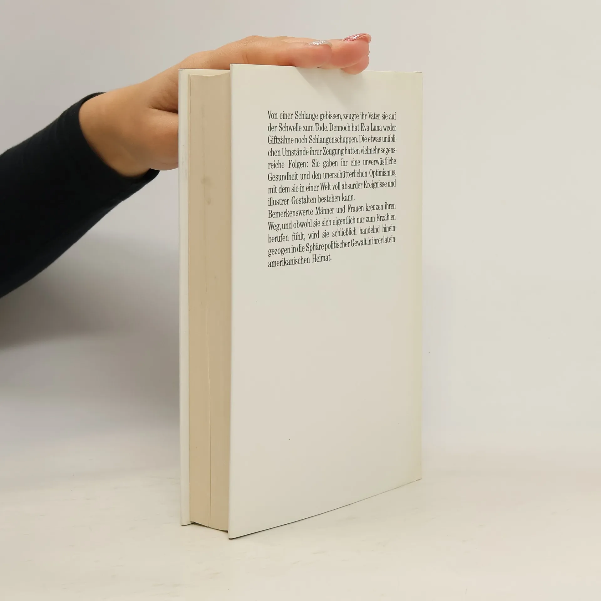 Das Waisenkind Eva Luna, von seinen Eltern auf äußerst ungewöhnliche Weise gezeugt, ist eine Geschichtenerzählerin wie Scheherazade. Und wie diese rettet auch sie mit ihren Geschichten Leben und erschafft sich eine eigene, bessere Welt. Die Menschen, auf die sie als Mädchen und später als junge Frau trifft, sind gleichermaßen fasziniert und auch teilweise erschrocken von diesem besonderen Menschen, dem noch die härteste Realität scheinbar nichts anzuhaben vermag. Eva, die immer noch mit ihrer toten Mutter kommuniziert, hat ein großes Herz, liebt ohne Vorbehalte und erfreut die Menschen, die ihr wichtig sind, mit ihren faszinierenden, verworrenen und unglaublichen Geschichten. Egal ob ihre Patin, ihre große Liebe Huberto Naranjo, die adoptierte Großmutter Elvira, Melecio, der so gerne eine Frau wäre, ihr Ziehvater Riad Halabi, der von einer Hasenscharte entstellt ist oder Rolf Carlé - sie alle halten Einzug in Evas Herz und in ihre Gedankenwelt, die so schön ist, so voller Phantasie und Erotik, dass es die Menschen zu Tränen rührt. Eva Luna macht ihren Weg, verliebt sich, muss wieder Abschied nehmen, findet verloren Geglaubte wieder und ist trotz aller Widrigkeiten immer voller Lebenslust. Sie wird hineingezogen in die Guerrillabewegung Chiles, steht für ihre Ideale ein und findet am Ende das, auf was sie immer gehofft hat - die Liebe, die ihrem Leben die Erfüllung gibt.