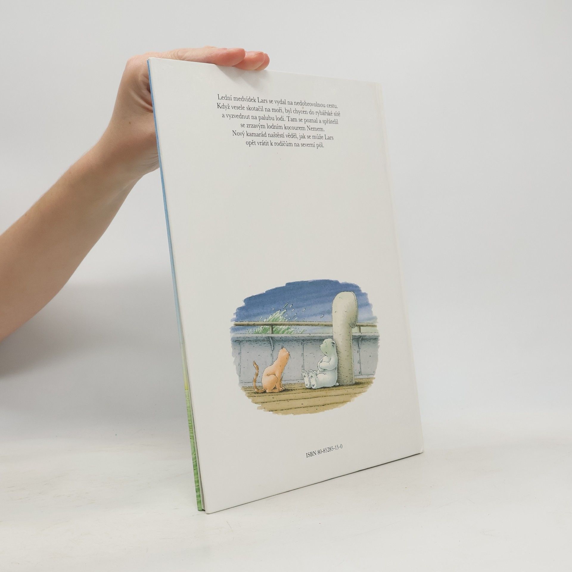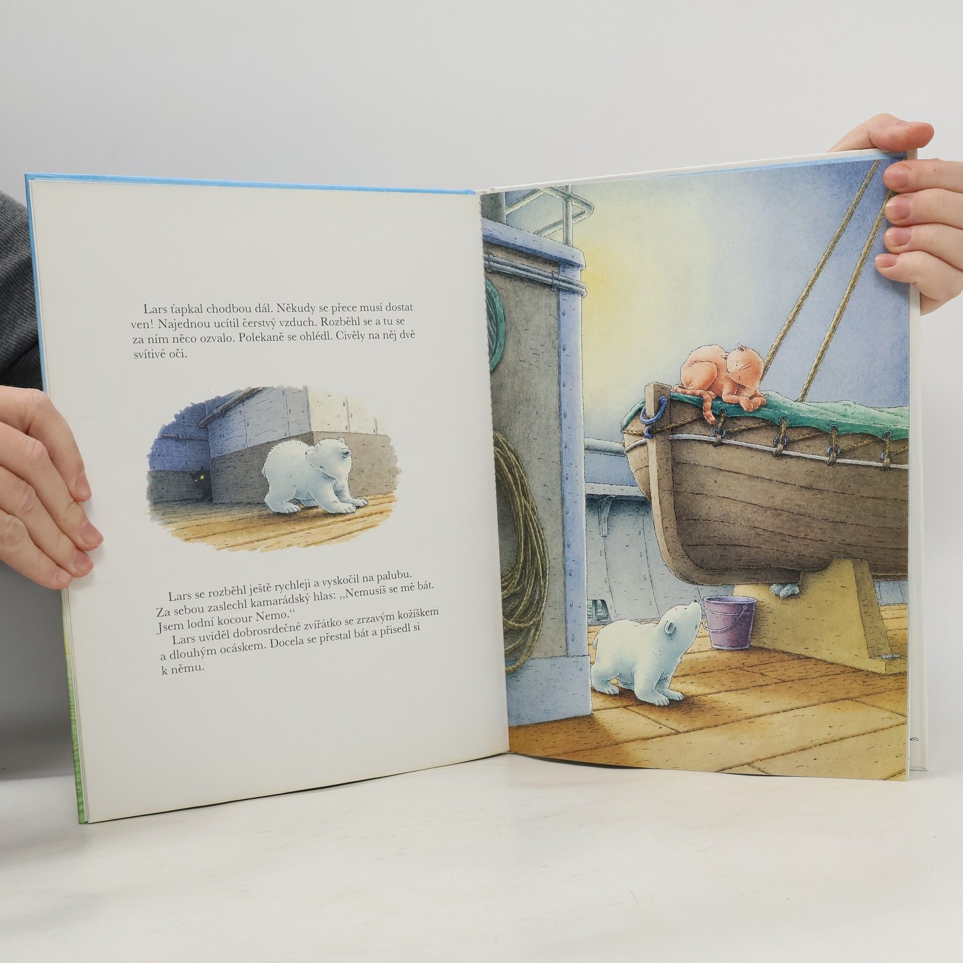 Vypráví a sám ilustruje autor. Lední medvídek Lars se vydal na nedobrovolnou cestu. Když vesele skotačil na moři, byl chycen do rybářské sítě a vyzvednut na palubu lodi. Tam se poznal a spřátelil se zrzavým lodním kocourem Nemem. Nový kamarád naštěstí věděl, jak se může Lars opět vrátit k rodičům na severní pol.