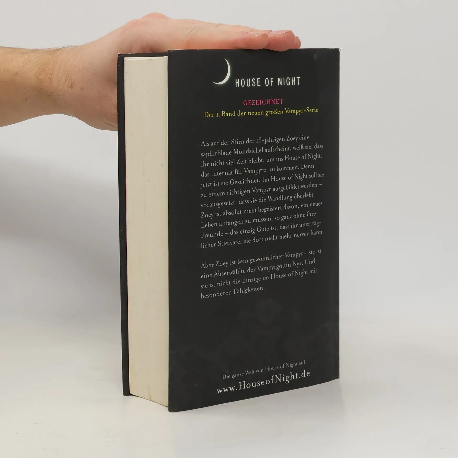 Als auf der Stirn der 16-jährigen Zoey eine saphirblaue Mondsichel aufscheint, ist ihr sofort klar, dass sie Gezeichnet worden ist und im House of Night zum Vampyr ausgebildet werden soll. Doch sie ist keine normale Jungvampyrin: Die Göttin Nyx hat sie mit besonderen Kräften versehen. Und Zoey ist nicht die Einzige im Internat mit solchen Fähigkeiten. Als sie herausfindet, dass die Anführerin der Töchter der Dunkelheit, einer Elitegruppe der Schule, ihre Gaben missbraucht, muss sie ihren ganzen Mut aufbringen, um sich ihrer Bestimmung zu stellen … Gezeichnet ist der furiose Auftakt zu Zoeys Entdeckungsreise zwischen den Welten, zwischen Licht und Dunkel und letztendlich zu sich selbst.