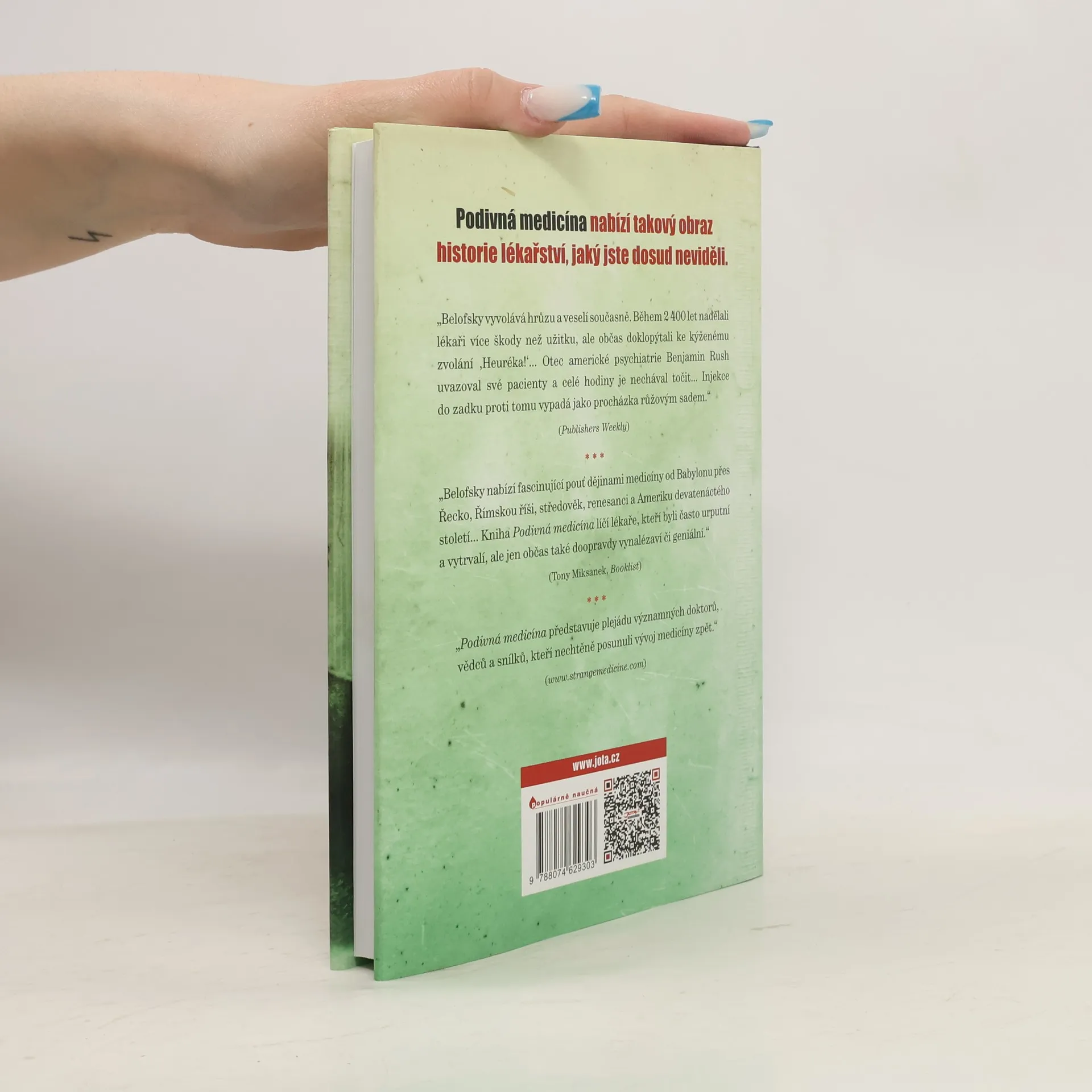 Kniha Podivná medicína nabízí pronikavý pohled na lékařskou praxi v průběhu historie. Upozorňuje na pochybné myšlenky, bizarně prováděná ošetření a na nejhrubší myslitelné chyby, jichž se lékaři dopouštěli. Kniha popisuje aplikaci chybných vědeckých závěrů stejně jako procedury, z nichž se obrací žaludek a které napáchaly na pacientech více škody než užitku. Najdeme v ní jména celého zástupu lékařů, vědců a snílků, kteří nevědomky otáčeli pozpátku ručičkami pomyslných hodin vývoje medicíny. Čtenář se například dozví, že se staří Egypťané snažili dnu léčit pomocí elektrického úhoře nebo že středověcí lékaři strkali pacientům do úst zapálené svíčky, aby odtamtud vypudili neviditelné červy, kteří jim ohlodávali zuby. Že renesanční lékaři určovali dobu operace podle postavení hvězd, kromě toho radili epileptikům, ať si shánějí krev čerstvě sťatých zločinců. Nebo že dr. Walter Freeman – přední světový praktik v oblasti lobotomie – prováděl své zákroky během prázdninových cest s rodinou. Do rodinného vozu naložil kromě dětí i chirurgické nástroje a pak již mohl mezi dny strávenými kempováním v lesích nořit sekáček na led do očních důlků svých pacientů