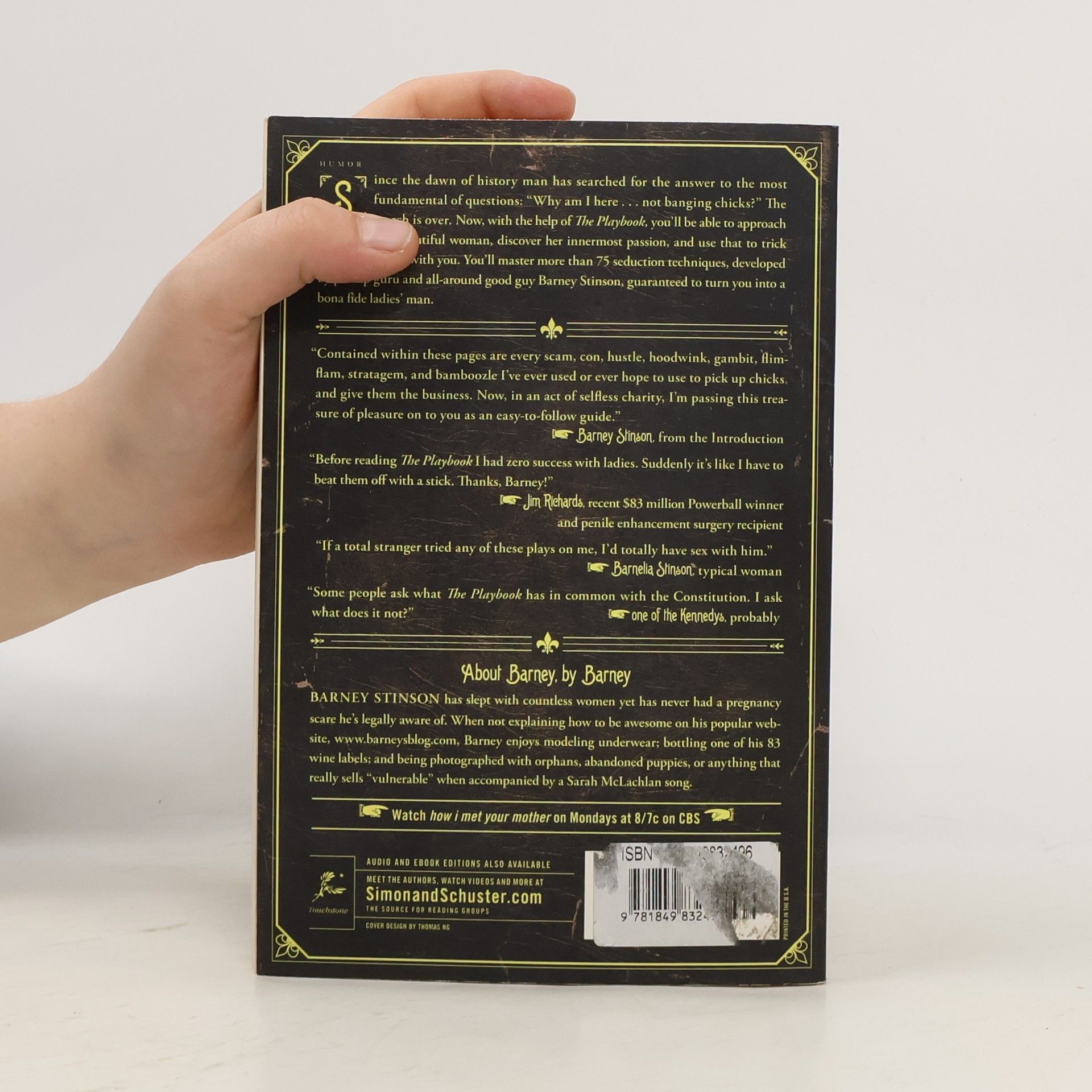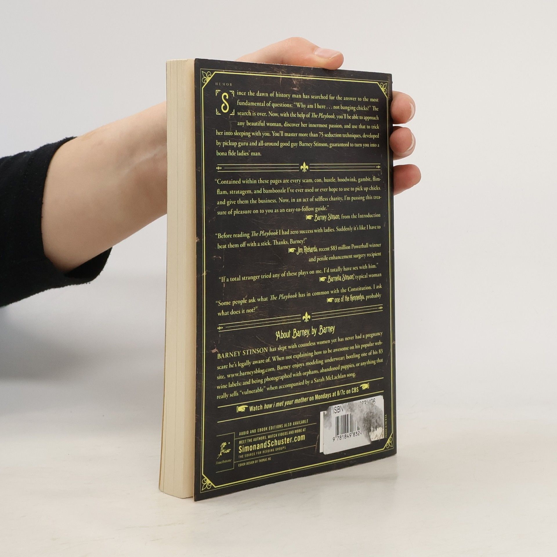 Since the dawn of history man has searched for the answer to the most fundamental of questions: "Why am I here . . . not banging chicks?" The search is over. Now, with the help of The Playbook, you'll be able to approach any beautiful woman, discover her innermost passion, and use that to trick her into sleeping with you. You'll master more than 75 seduction techniques, developed by pickup guru and all-around good guy Barney Stinson, guaranteed to turn you into a bona fide ladies' man.