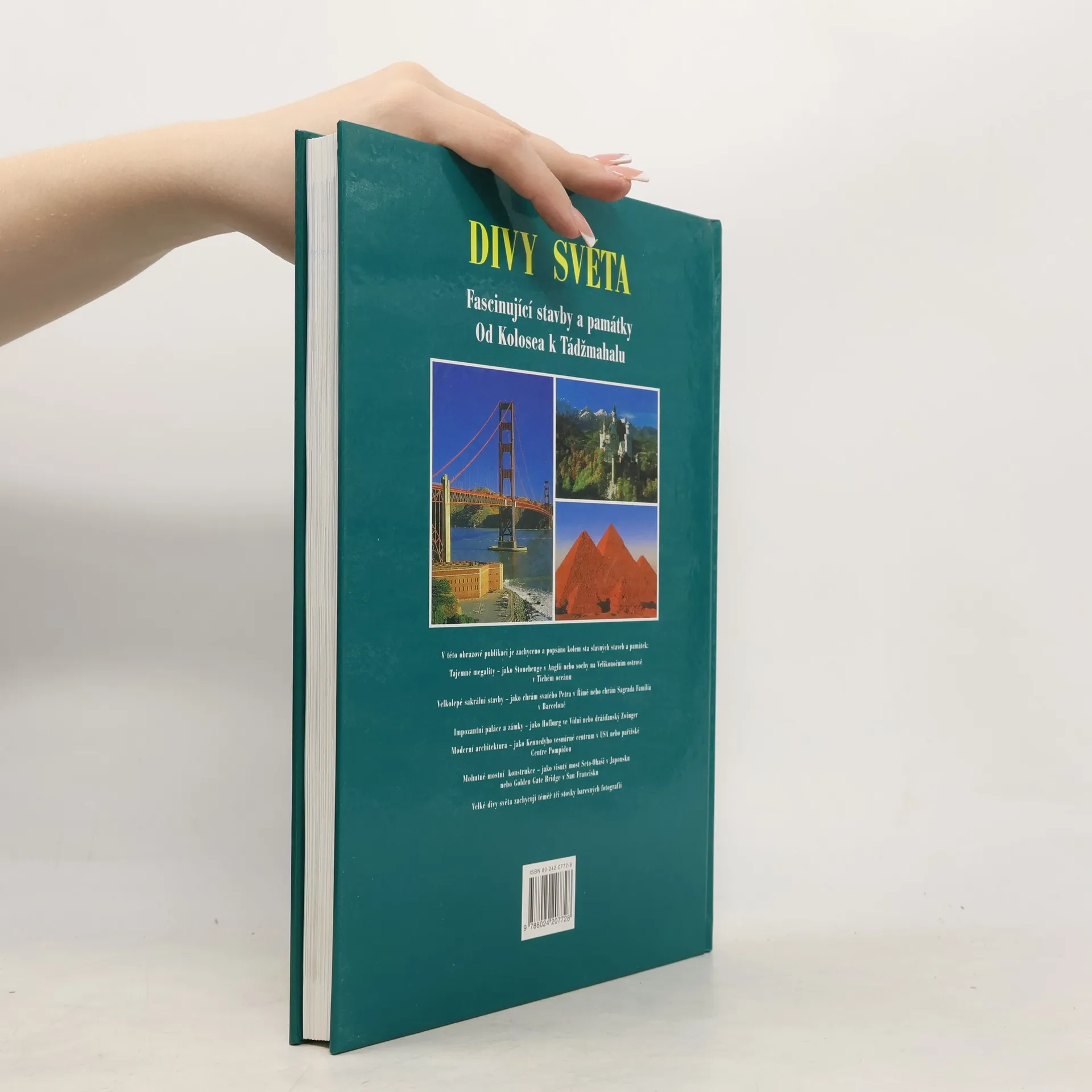 Tato obrazová publikace předvádí na stovku pozoruhodných a facsinujících staveb v rozmezí deseti tisíc let. Spektrum je široké, chrámy kostely, paláce a zámky, ale i ulice plné vody, přehrady, železnice a samozřejmě i věže a mrakodrapy našeho století. Publikace je rozdělena podle světadílů, stati udávají jednotlivé tematické okruhy jako například kostely skouží fundované historické informaci a usnadňuje přehled. Každé stabě je věnována jedna dvojstrana. Fascinující obrazy - kolem tři set dokonalých barevných fotografií - předvádějí velké divy tohoto světa.