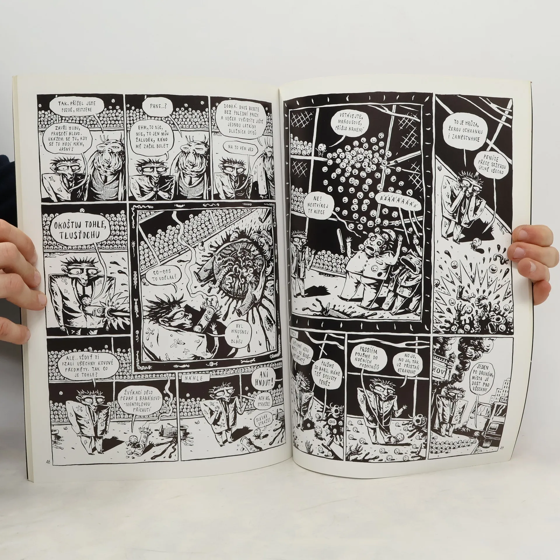 Comics o našem světě a o onom světě a taky o různých pocitech mezi tím. Dozvíte se v něm humornou, inteligentní a nenásilnou formou odpovědi na spousty důležitých otázek, které se vám budou v životě velice hodit. Jak vznikají plastikoví lidé? Jak to chodí v Říši mrtvých? Kam se ztrácejí odstřelené domy? Co mají společného bazuky a cukrátka? Co se skrývá na zakrváceném vrcholku pyramidy IKEA? Proč nemohou peníze pít alkohol? Jak se šňupe budoucnost? Kolik stojí nové tělo? A hlavně: kdo pořád píše na obaly od mléka ty návody, jak správně a dobře žít??