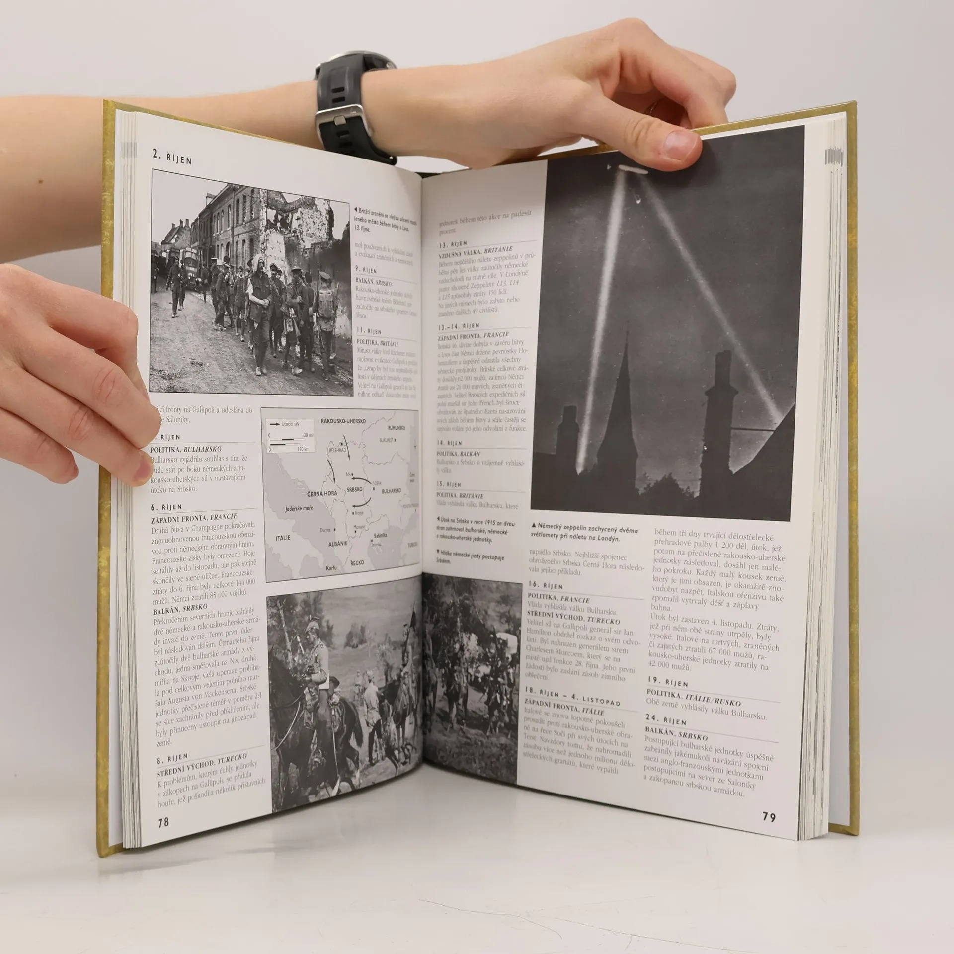 První světová válka den po dni je chronologickou historií tohoto konfliktu od prvních výstřelů v Sarajevu v červnu 1914 až do uzavření příměří v listopadu 1918. Jsou v ní popisovány události na všech bojištích, stejně jako boje ve vzduchu a na moři. Jsou zmiňovány i špionáž, události na domácích frontách, politické okolnosti a technické prostředky, jež měly podstatný vliv na průběh válečných událostí. Mimo to jsou součástí knihy i zvláštní kapitoly pojednávající o klíčových osobnostech války, nejdůležitějších zbraních, událostech a otázkách strategie a taktiky. Kniha obsahuje téměř 400 fotografií a map.