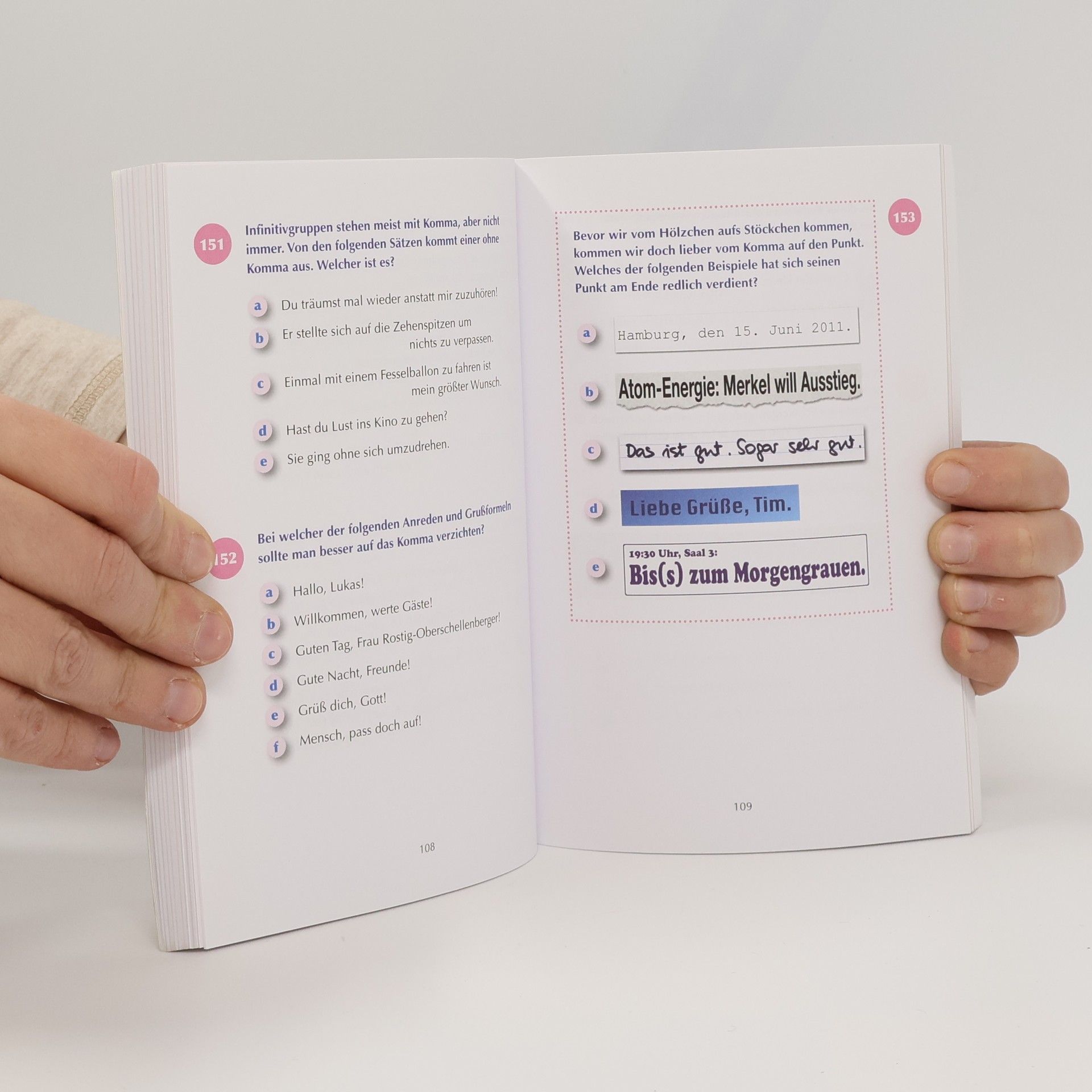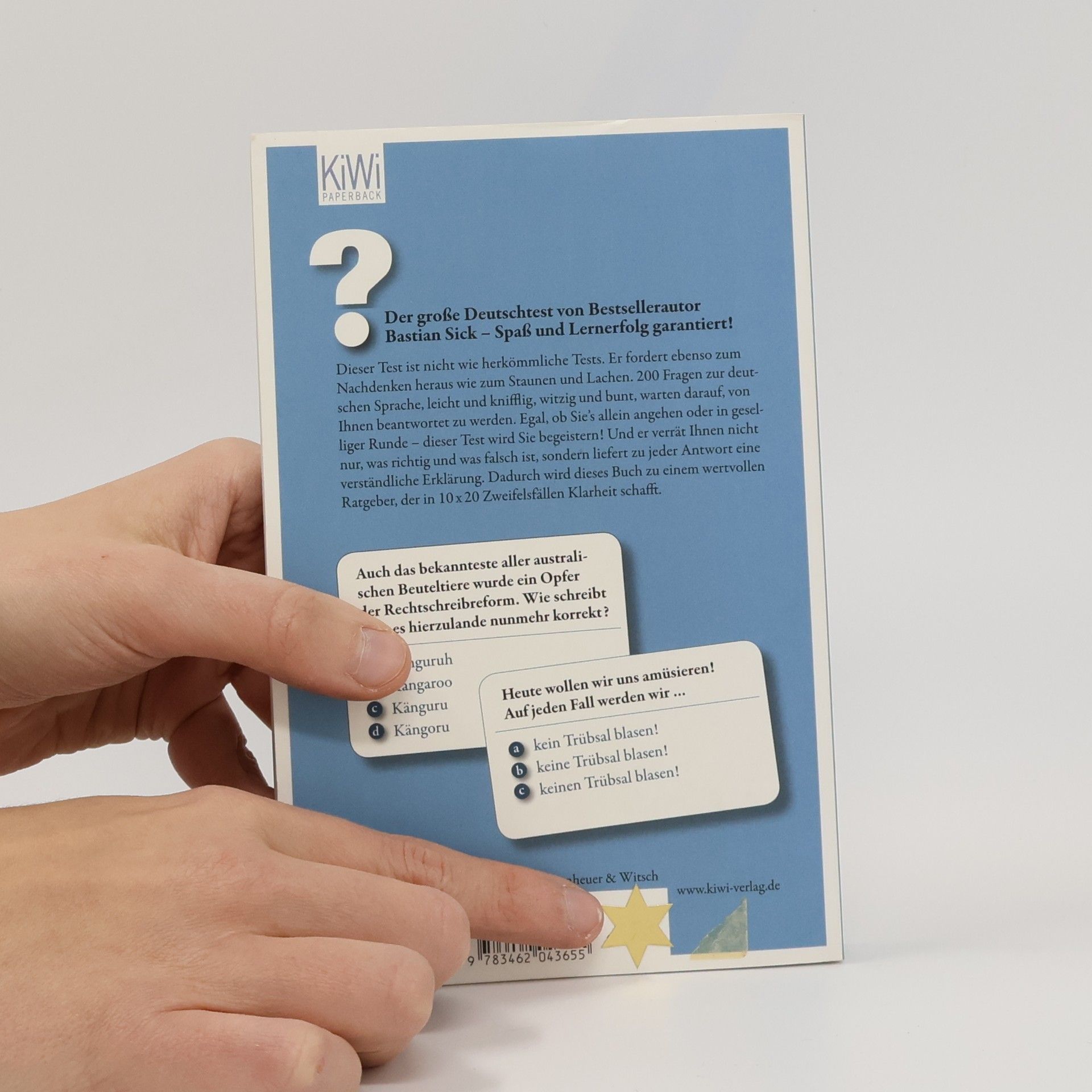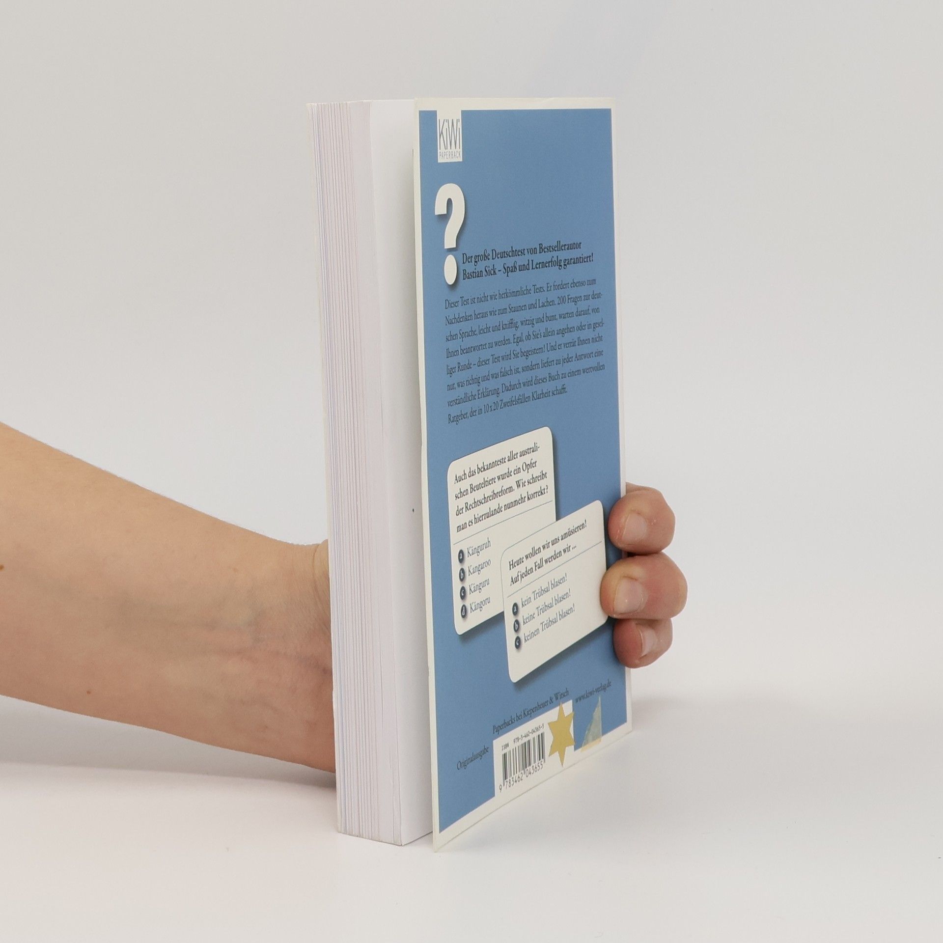 Dieser Autor strapaziert a) Ihr Zwergfell b) Ihr Zwerchfell c) Ihr Zwärchfell oder gar d) Ihr Zwärgfell Wie lautet die Mehrzahl von Oktopus? Was ist ein Pranzer? Wofür stand die Abkürzung SMS vor hundert Jahren? Und ist Brad Pitt nun der gutaussehendste, bestaussehendste oder am besten aussehende Filmstar unserer Zeit? Der große Deutschtest von Bestsellerautor Bastian Sick versammelt spannende Fragen aus dem Fundus der Irrungen und Wirrungen unseres Sprachalltags – zur Rechtschreibung und Zeichensetzung, zur Grammatik und zum Stil. Leichte und kniffelige Fragen sind dabei bunt gemischt. Nicht immer geht es um richtig oder falsch, manchmal wird unter mehreren Möglichkeiten die »optimalste« gesucht. Und manchmal ist mehr als nur eine Antwort richtig. Finden Sie heraus, ob Sie im PISA-Durchschnitt liegen, ob Sie das Zeug zum Deutschlehrer haben oder ob Sie womöglich ein Alleswisser sind – Spaß und Lernerfolg garantiert!