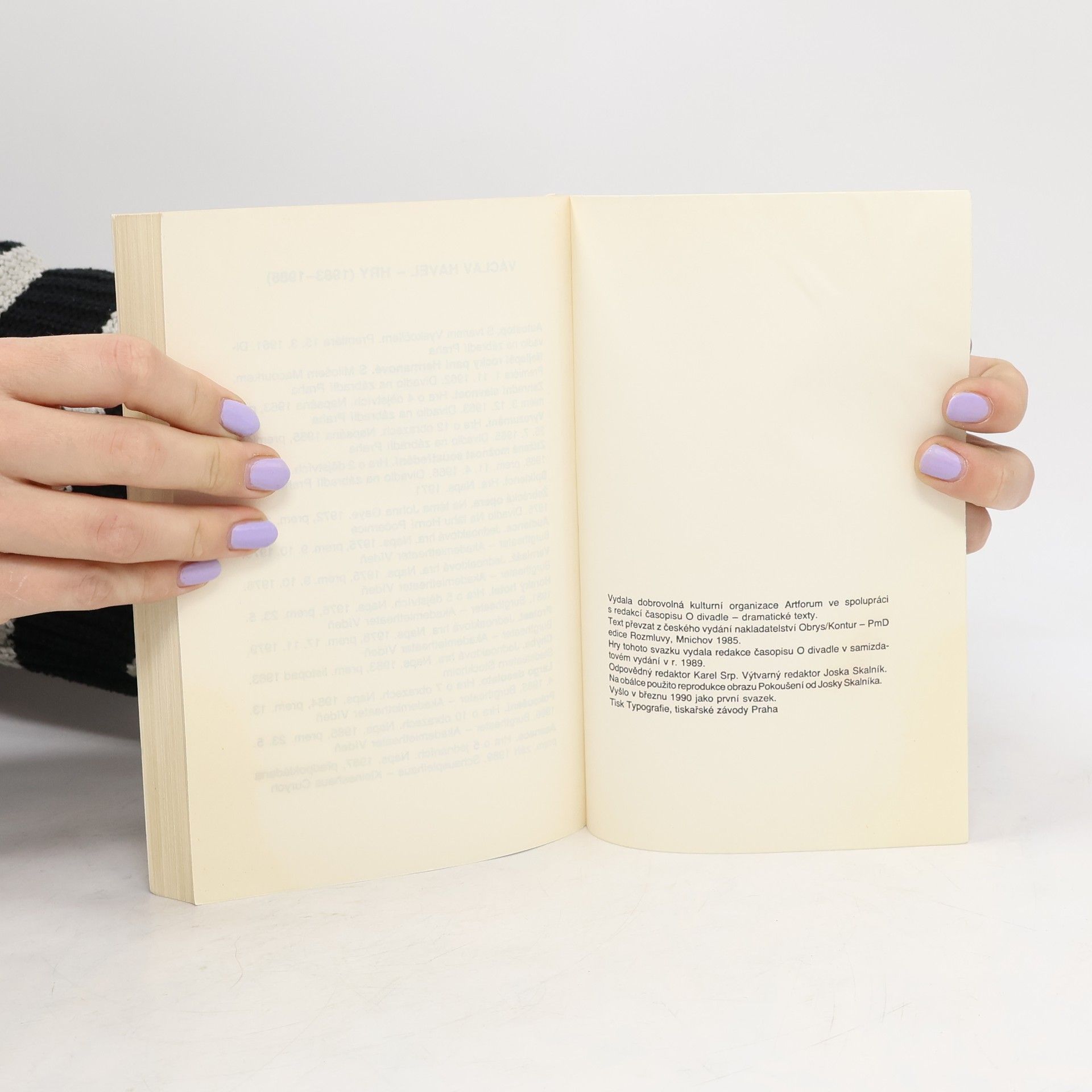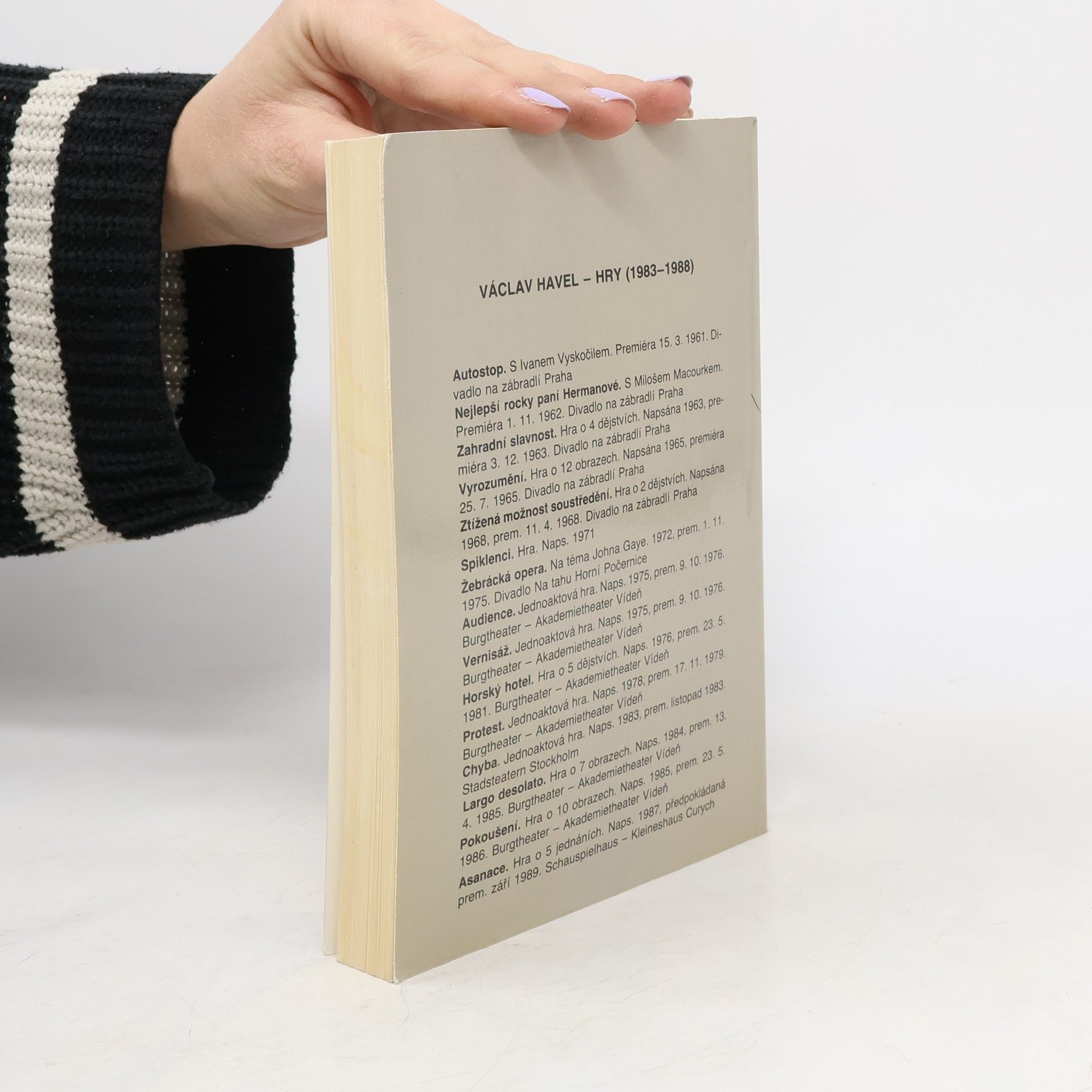 Reprezentativní soubor her Václava Havla (1936–2011) zastupuje v České knižnici nejen disidentskou tvorbu coby platformu pro vytyčování závažných společenských a politických otázek současnosti i budoucnosti. Zvolená koncepce svazku představuje Havlovu tvorbu v jejích čtenářsky i divácky oblíbených, dnes už klasických dílech, proslulých úspěšnými jevištními realizacemi na domácích i zahraničních scénách. Z autorova raného tvůrčího období přináší Zahradní slavnost, Vyrozumění a Ztíženou možnost soustředění, následují hry z doby disentu Žebrácká opera, Audience, Vernisáž, Largo desolato a Pokoušení.