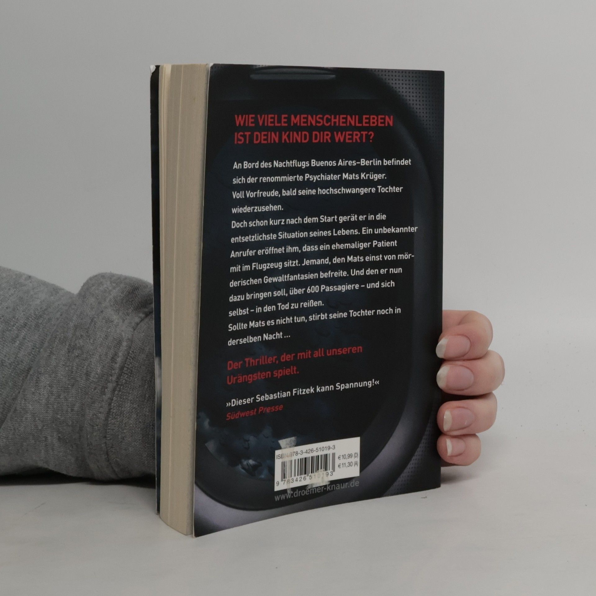 In diesem Psychothriller von Bestseller-Autor Sebastian Fitzek geht es um die tiefsten menschlichen Ängste des Eingeschlossenseins und der Hilflosigkeit in einem Flugzeug. Mats Krüger, ein erfolgreicher Psychiater, muss seine panische Flugangst überwinden, als seine hochschwangere Tochter Nele nach Jahren des Schweigens Kontakt zu ihm aufnimmt. Mats, der nach dem Tod seiner Frau nach Argentinien ausgewandert ist, wird gebeten, nach der Geburt des Babys zu helfen. Nach einem Flugangst-Seminar besteigt Mats den Langstreckenflug von Buenos Aires nach Berlin. Kurz nach dem Einnehmen seines Platzes wird ihm klar, dass er sich auf die falschen Ängste vorbereitet hat. Es sind nicht Turbulenzen oder Terrorwarnungen, die ihn in einen seelischen Ausnahmezustand versetzen, sondern ein Anruf eines Unbekannten. Dieser informiert ihn, dass sich ein ehemaliger Patient an Bord befindet, jemand, den Mats einst von mörderischen Gewaltphantasien befreite. Nun wird Mats gezwungen, zu verhindern, dass dieser Patient über 600 Passagiere und sich selbst in den Tod reißt. Ein packender Thriller, der die Grenzen der Psyche auslotet.