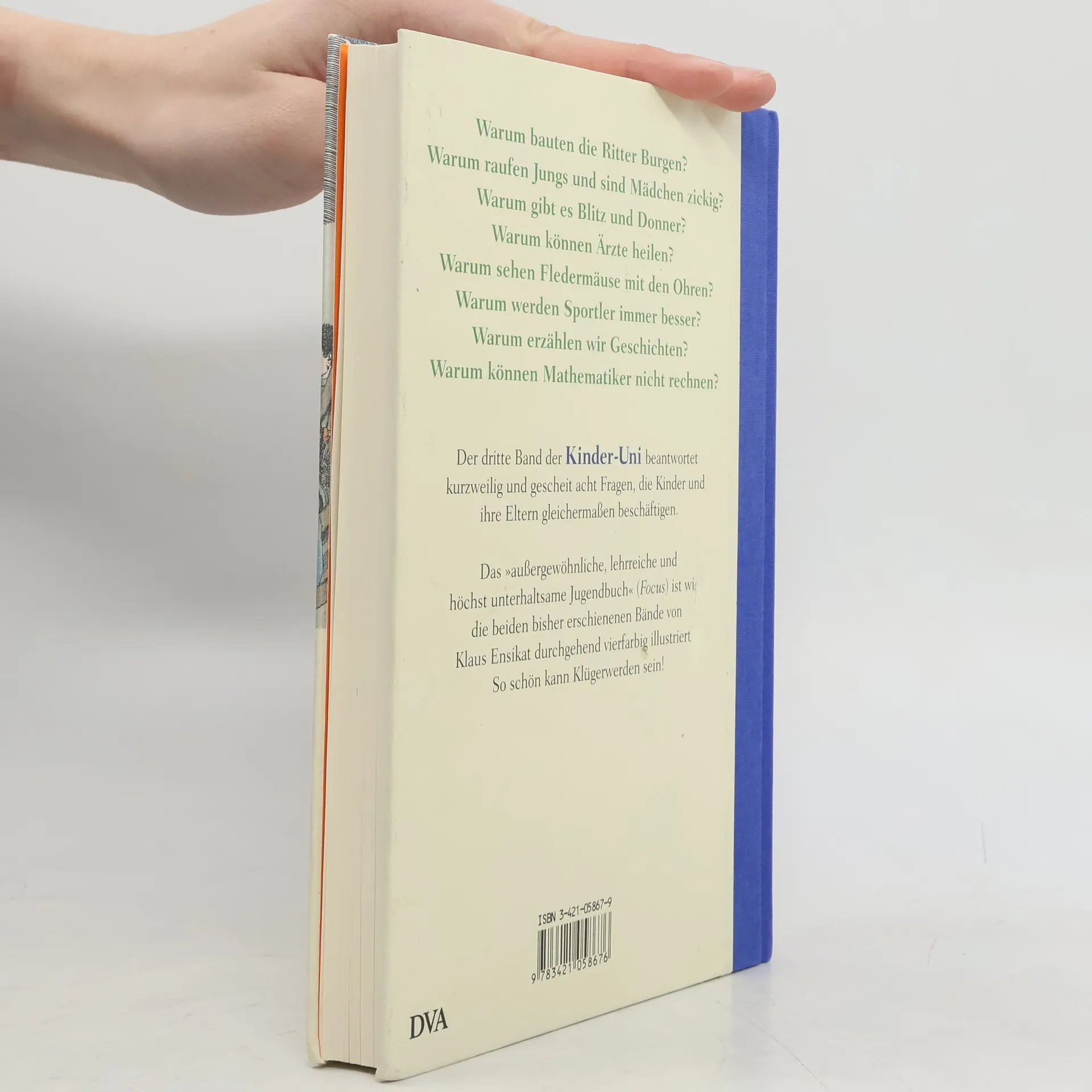 Warum bauten die Ritter Burgen? Warum gibt es Blitz und Donner? Warum raufen Jungs und sind Mädchen zickig? Warum sehen Fledermäuse mit den Ohren? Warum können Mathematiker nicht rechnen? Warum erzählen wir Geschichten? Warum können Ärzte heilen? Warum werden Sportler immer besser?