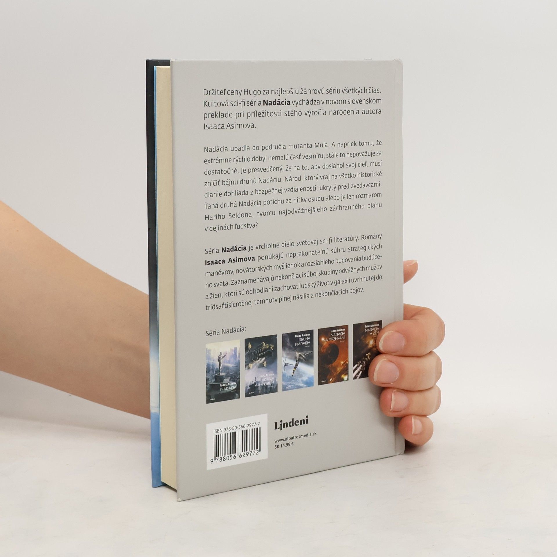 Držiteľ ceny Hugo za najlepšiu žánrovú sériu všetkých čias. Kultová sci-fi séria Nadácia vychádza v novom slovenskom preklade pri príležitosti stého výročia narodenia autora Isaaca Asimova. Nadácia upadla do područia mutanta Mula. A napriek tomu, že extrémne rýchlo dobyl nemalú časť vesmíru, stále to nepovažuje za dostatočné. Je presvedčený, že na to, aby dosiahol svoj cieľ, musí zničiť bájnu druhú Nadáciu. Národ, ktorý vraj na všetko historické dianie dohliada z bezpečnej vzdialenosti, ukrytý pred zvedavcami. Ťahá druhá Nadácia potichu za nitky osudu alebo je len rozmarom Hariho Seldona, tvorcu najodvážnejšieho záchranného plánu v dejinách ľudstva? Séria Nadácia je vrcholné dielo svetovej sci-fi literatúry. Romány Isaaca Asimova ponúkajú neprekonateľnú súhru strategických manévrov, novátorských myšlienok a rozsiahleho budovania budúceho sveta. Zaznamenávajú nekončiaci súboj skupiny odvážnych mužov a žien‚ ktorí sú odhodlaní zachovať ľudský život v galaxii uvrhnutej do tridsaťtisícročnej temnoty plnej násilia a nekončiacich bojov.