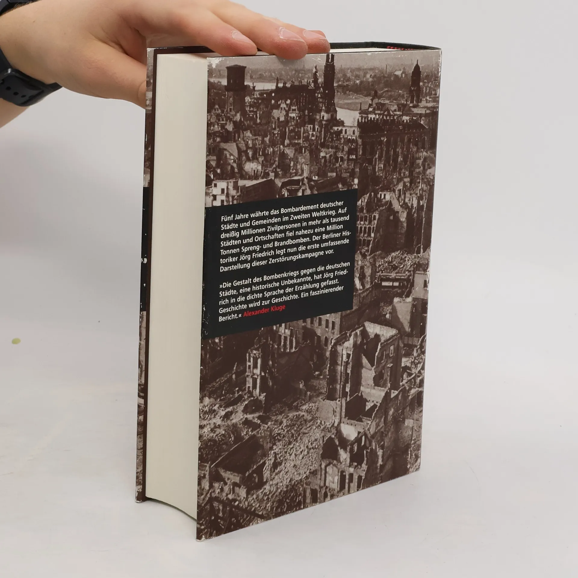 Fünf Jahre lang lagen Deutschlands Städte im Zweiten Weltkrieg unter Dauerbombardement. Mehr als 600 000 Zivilopfer waren zu beklagen, die historisch gewachsene Städtelandschaft versank unwiederbringlich. Der Historiker Jörg Friedrich legt die erste umfassende Darstellung dieser Katastrophe vor, die trotz ihrer beispiellosen Dimension im nationalen Gedächtnis der Deutschen kaum Niederschlag gefunden hat.