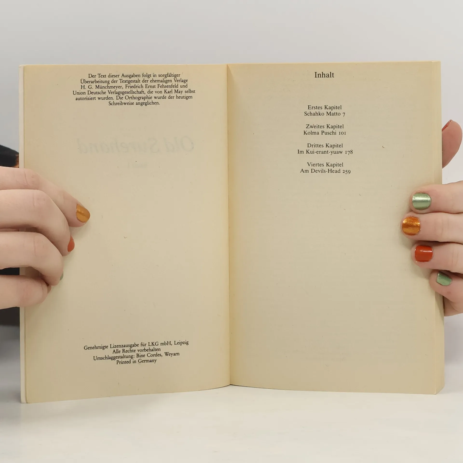 Karl May: Old Surehand III Edition Holzinger. Taschenbuch Berliner Ausgabe, 2013 Vollstandiger, durchgesehener Neusatz mit einer Biographie des Autors bearbeitet und eingerichtet von Michael Holzinger Entstanden 1896. Erste Buchausgabe: Freiburg i.Br. (Friedrich Ernst Fehsenfeld) 1896 (= Karl May's gesammelte Reisererzahlungen. Band 19). Textgrundlage ist die Ausgabe: Old Surehand. 3. Band. Illustrierte Reiseerzahlungen von Karl May. 1.-7. Tsd. - Freiburg i.Br.: Friedrich Ernst Fehsenfeld 1909. 2 Bl., 566 S., 1 Bl. - = Karl Mays Illustrierte Reiseerzahlungen. Band XIII. Herausgeber der Reihe: Michael Holzinger Reihengestaltung: Viktor Harvion Umschlaggestaltung unter Verwendung des Bildes: Karl May (Fotografie von Erwin Raupp, 1907) Gesetzt aus Minion Pro, 10 pt