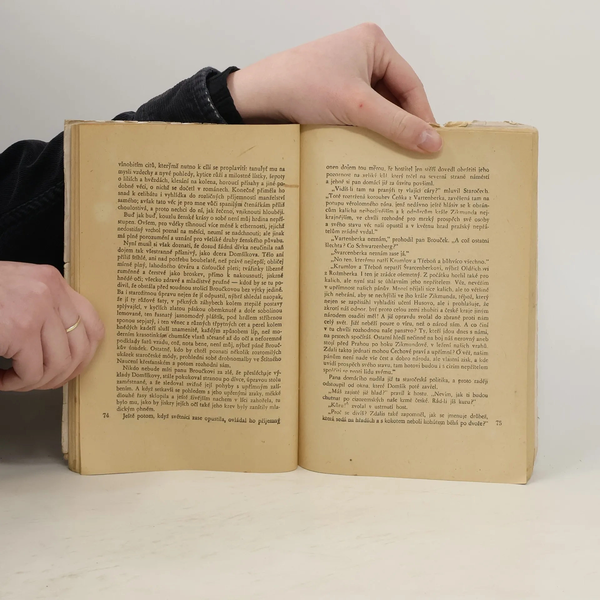 Ve druhé knize se autor s kritikou zaměřuje zejména na samotného Broučka. Ten se tajemnou podzemní chodbou ocitne náhle v patnáctém století, v husitské Praze připravující se na boj s křižáky. Ujme se jej pan Domšík, provádí ho po Praze a ubytuje Broučka ve své domácnosti. Autor důkladně využívá v pozdější době běžný prvek fantastických příběhů – konfrontaci obyčejného člověka s cizím prostředím, s jinou časovou rovinou. Při srovnání měla vyniknout Broučkova zbabělost a nedostatek morálky v protikladu s hrdinstvím husitů. Reálnost prožitého dobrodružství je v závěru opět zpochybněna Broučkovým procitnutím na dvorku hospody Vikárka. Výlety pana Broučka byly Leošem Janáčkem ztvárněny v podobě opery.