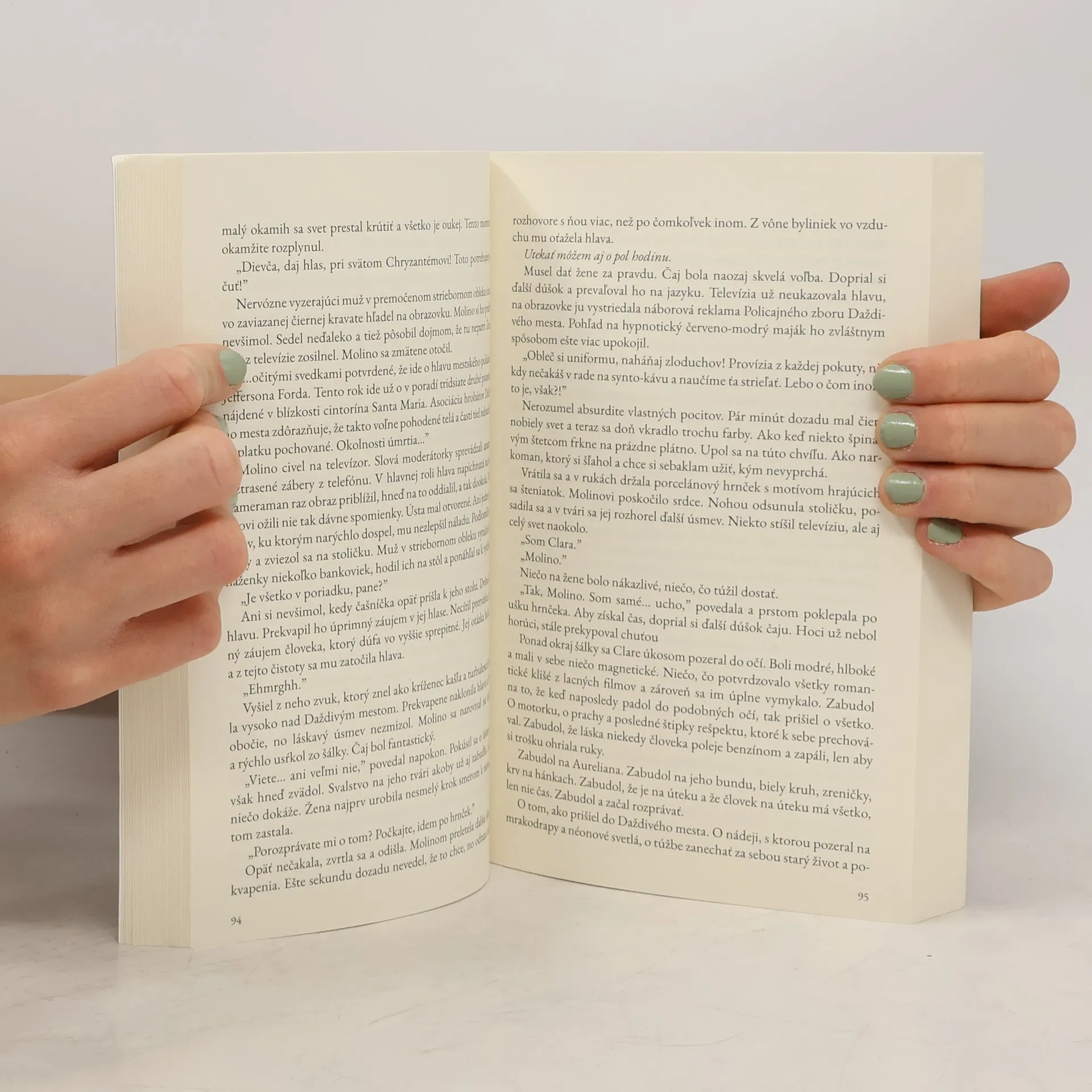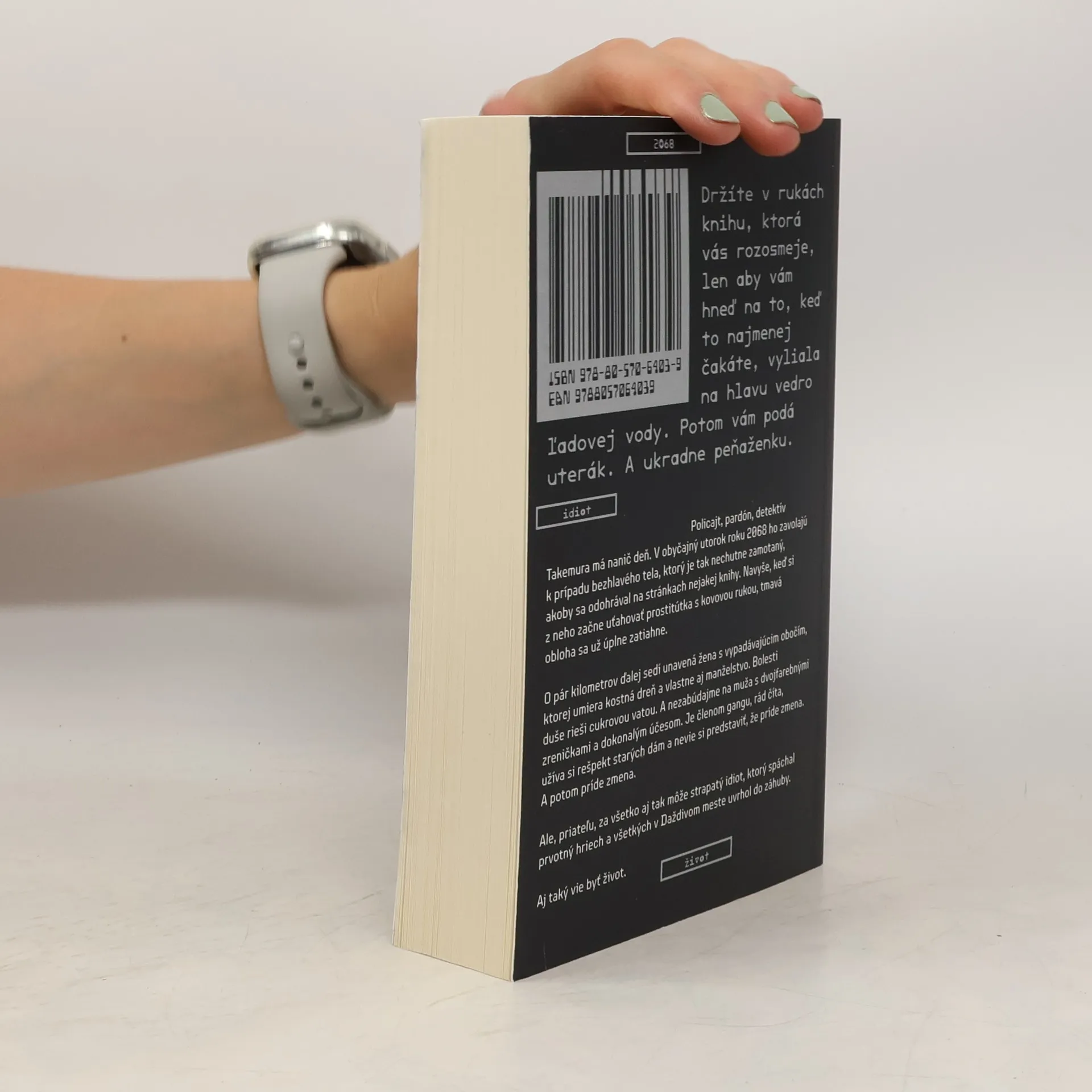 Policajt, pardón, detektív Takemura má nanič deň. V obyčajný utorok roku 2068 ho zavolajú k prípadu bezhlavého tela, ktorý je tak nechutne zamotaný, akoby sa odohrával na stránkach nejakej knihy. Navyše, keď si z neho začne uťahovať prostitútka s kovovou rukou, tmavá obloha sa už úplne zatiahne. O pár kilometrov ďalej sedí unavená žena s vypadávajúcim obočím, ktorej umiera kostná dreň a vlastne aj manželstvo. Bolesti duše rieši cukrovou vatou. A nezabúdajme na muža s dvojfarebnými zreničkami a dokonalým účesom. Je členom gangu, rád číta, užíva si rešpekt starých dám a nevie si predstaviť, že príde zmena. A potom príde zmena. Ale, priateľu, za všetko aj tak môže strapatý idiot, ktorý spáchal prvotný hriech a všetkých v Daždivom meste uvrhol do záhuby. Aj taký vie byť život.