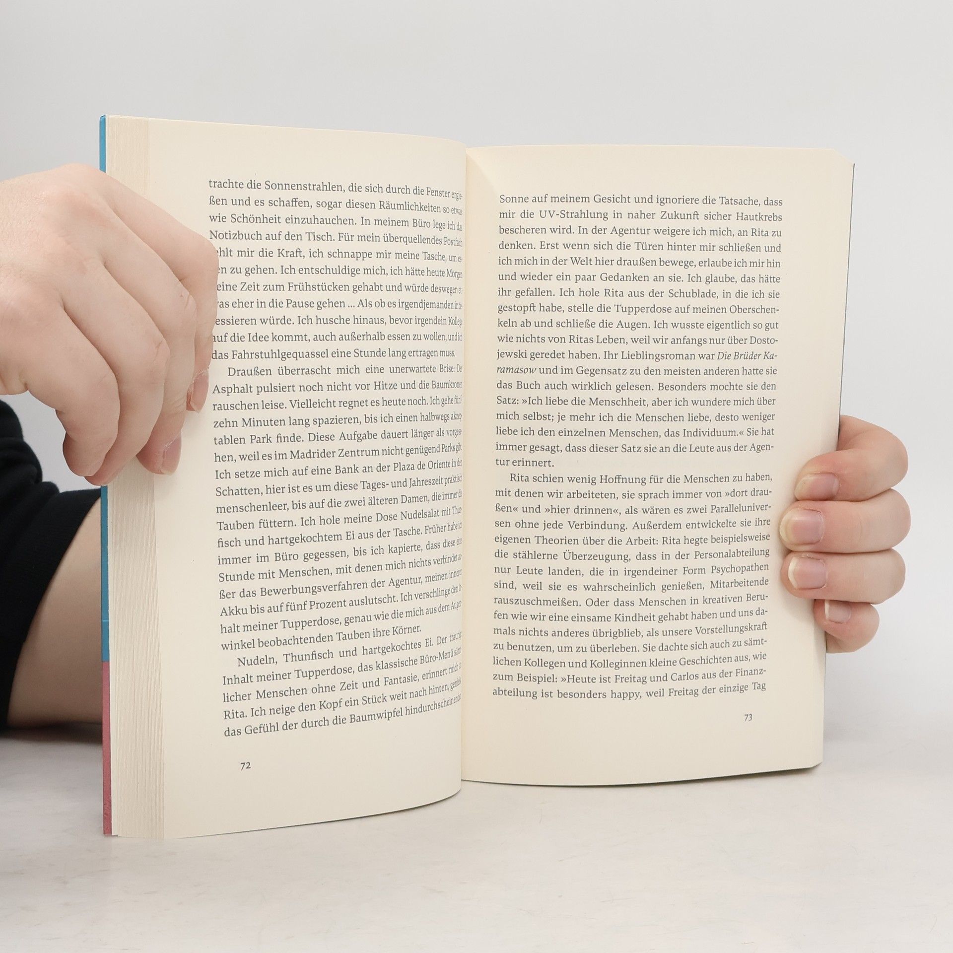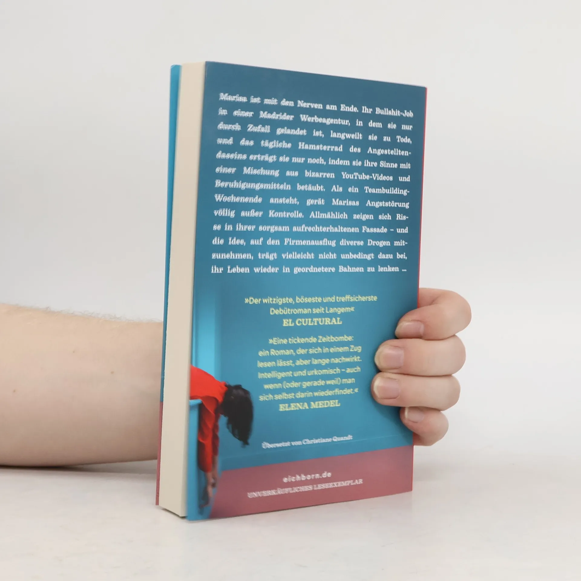 Marisa ist mit den Nerven am Ende. Ihr Bullshit-Job in einer Madrider Werbeagentur, in dem sie nur durch Zufall gelandet ist, langweilt sie zu Tode, und das tägliche Hamsterrad des Angestelltendaseins erträgt sie nur noch, indem sie ihre Sinne mit einer Mischung aus bizarren YouTube- Videos und Beruhigungsmitteln betäubt. Als ein Teambuilding-Wochenende ansteht, gerät Marisas Angststörung völlig außer Kontrolle. Allmählich zeigen sich Risse in ihrer sorgsam aufrechterhaltenen Fassade - und die Idee, auf den Firmenausflug diverse Drogen mitzunehmen, trägt vielleicht nicht unbedingt dazu bei, ihr Leben wieder in geordnetere Bahnen zu lenken ...