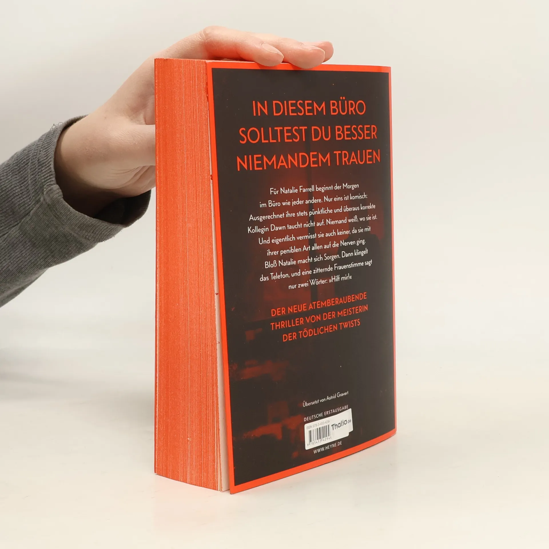 Zwei Frauen. Ein Büro. Ein schreckliches Verbrechen. Mit farbig gestaltetem Buchschnitt in limitierter Erstauflage Dawn Schiff ist seltsam. Darin sind sich ihre Kollegen einig. Sie sagt nie das Richtige. Sie hat keine Freunde. Aber sie ist jeden Morgen um Punkt 8:45 Uhr an ihrem Platz in der Firma, in der sie als Buchhalterin arbeitet. Bis sie eines Morgens nicht auftaucht. Dawns Kollegin Natalie Farrell wundert sich. Dann erhält sie einen anonymen Anruf und fährt zu Dawns Wohnung. Keine Spur von ihrer Kollegin. Doch Natalie bietet sich ein Bild des Grauens. Eins scheint bald klar: Jemand muss Dawn so sehr gehasst haben, dass er sie getötet hat. War es jemand aus ihrem Büro? Je mehr Natalie herausfindet, desto tiefer verstrickt sie sich selbst in ein Netz aus Lügen und Gewalt, aus dem es kein Entkommen gibt. Mit farbig gestaltetem Buchschnitt