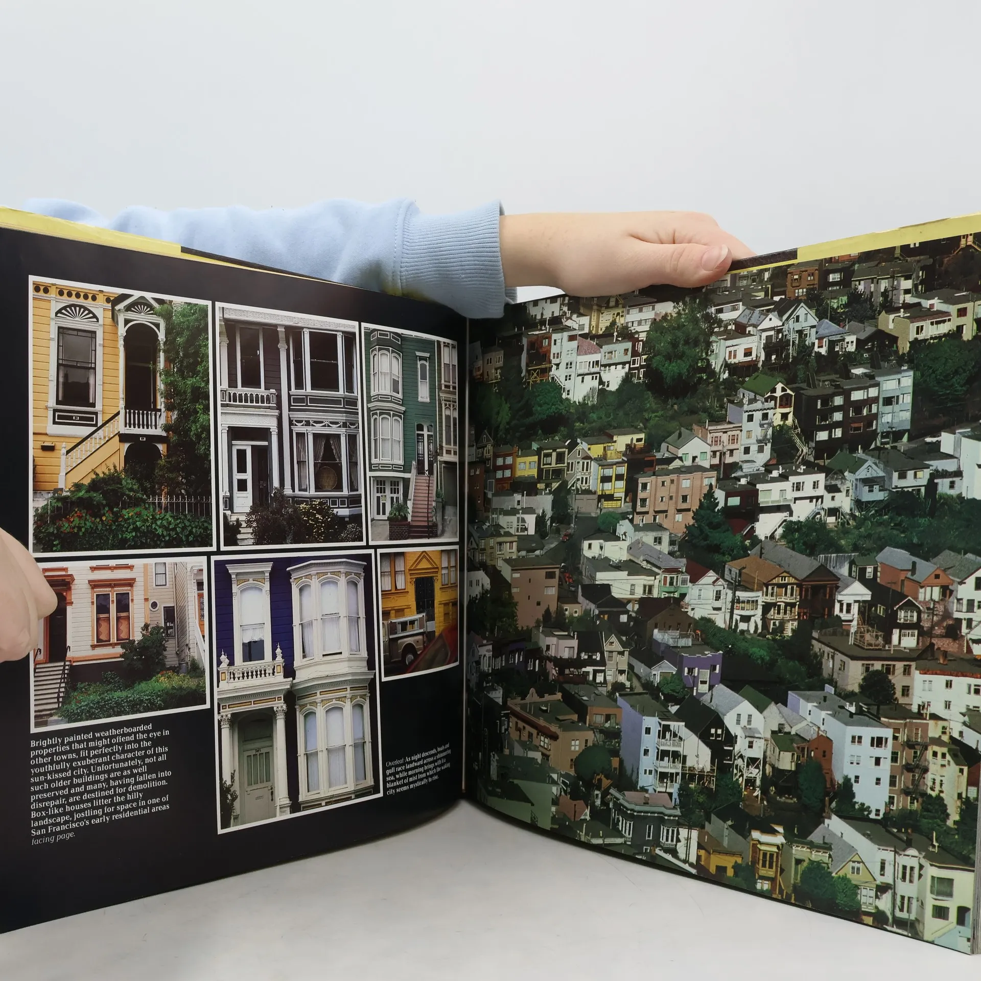 A description of San Francisco and its history accompanies color photographs showing the city's streets, shops, harbor, homes, skyline, and parks
