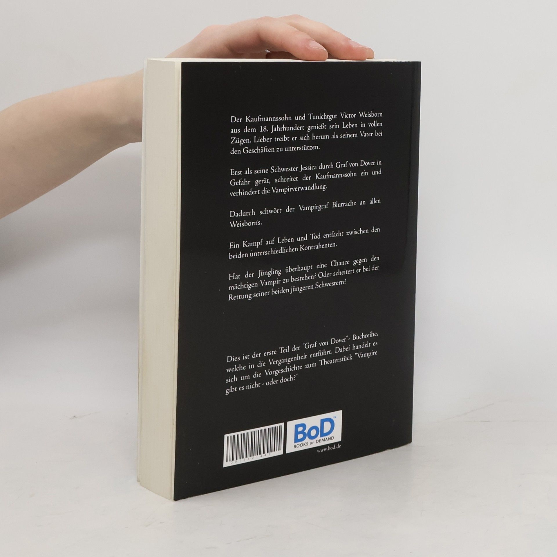 Der Kaufmannssohn und Tunichtgut Victor Weisborn aus dem 18. Jahrhundert genießt sein Leben in vollen Zügen. Lieber treibt er sich herum als seinem Vater bei den Geschäften zu unterstützen. Erst als seine Schwester Jessica durch Graf von Dover in Gefahr gerät, schreitet er ein und verhindert ihre Verwandlung zum Vampir. Wut schäumend schwört der grausame Vampirgraf Blutrache an allen Weisborns. Sofort entfacht ein Kampf auf Leben und Tod zwischen den beiden unterschiedlichen Kontrahenten. - Hat der Jüngling überhaupt eine Chance gegen den mächtigen Vampir zu bestehen? Oder scheitert er bei der Rettung seiner beiden jüngeren Schwestern? Dies ist der erste Teil der "Graf von Dover" - Buchreihe, welche in die Vergangenheit entführt. Dabei handelt es sich um die Vorgeschichte zum Theaterstück "Vampire gibt es nicht - oder doch?"