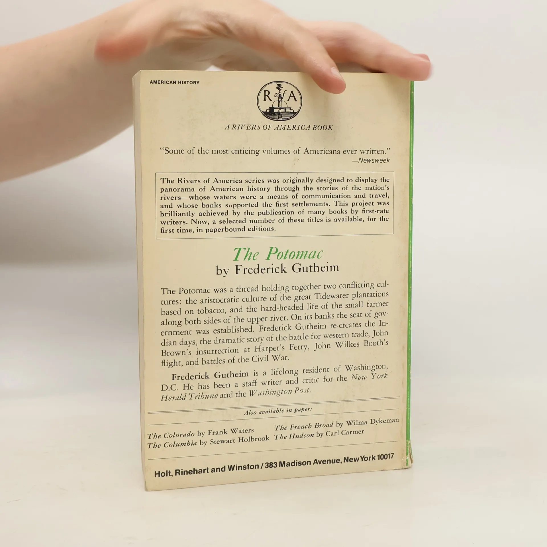 The Potomac", one of the most celebrated volumes in the Rivers of America series. Frederick Gutheim follows the Potomac from its source in West Virginia to the Chesapeake Bay. Along the way, he brings to life the planters and presidents, frontiersmen and industrialists who have shaped the region's history. From Captain John Smith's 1609 expedition upriver to John Adam's doubting view of the still undeveloped federal city, from the insurrection at Harper's Ferry to the rapid transformation of twentieth-century Washington into a living -- and at times unruly -- metropolis, "The Potomac" traces the life of a great river and of the people who have lived along its banks.