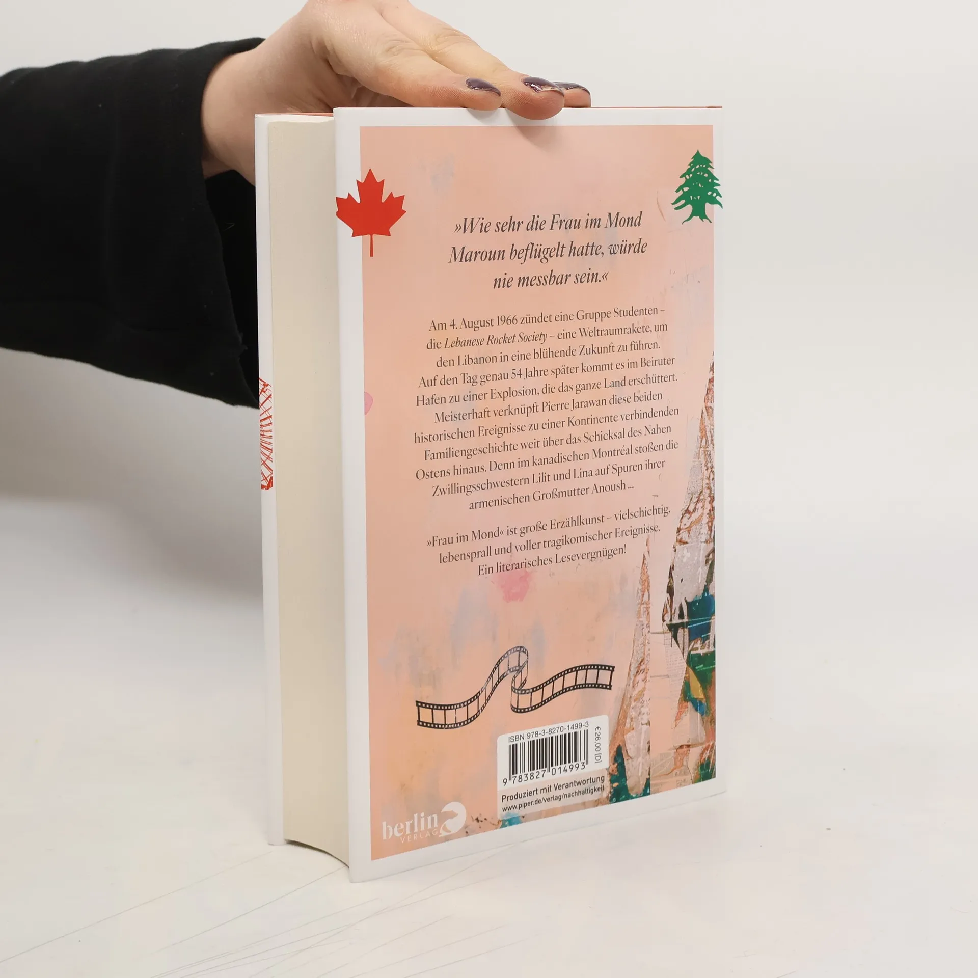 Am 4. August 1966 zündet eine Gruppe Studenten – die Lebanese Rocket Society – eine Weltraumrakete, um den Libanon in eine blühende Zukunft zu führen. Auf den Tag genau 54 Jahre später kommt es im Beiruter Hafen zu einer Explosion, die das ganze Land erschüttert. Meisterhaft verknüpft Pierre Jarawan diese beiden historischen Ereignisse zu einer Kontinente verbindenden Familiengeschichte weit über das Schicksal des Nahen Ostens hinaus. Denn im kanadischen Montréal stoßen die Zwillingsschwestern Lilit und Lina auf Spuren ihrer armenischen Großmutter Anoush ... „Frau im Mond“ ist große Erzählkunst – vielschichtig, lebensprall und voller tragikomischer Ereignisse. Ein sagenhaftes Lesevergnügen!
