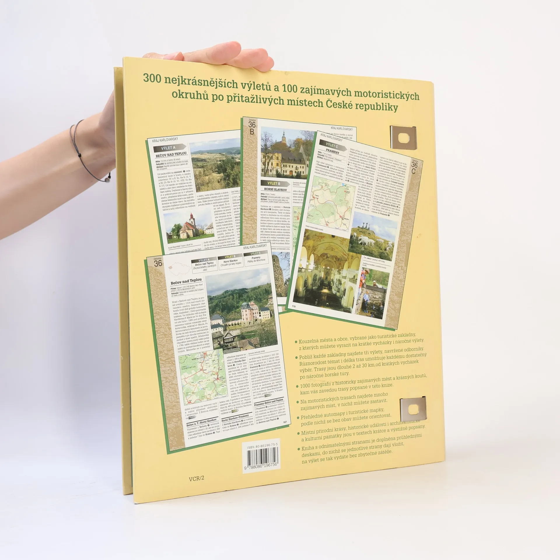 -Kouzelná města a obce, vybrané jako turistické základny, z kterých můžete vyrazit na krátké vycházky i náročné výlety. -Poblíž každé základny najdete tři výlety. Různorodost témat i délka tras umožňuje každému dostatečný výběr. Trasy jsou dlouhé 2 až 30 km, od krátkých vycházek po náročné horské túry. -1000 fotografií z historicky zajímavých měst a krásných koutů. -Přehledné automapy i turistické mapky. -Kniha s odnímatelnými stranami je doplněna průhlednými deskami, do nichž se dají jednotlivé strany vložit. -300 výletů a 100 motoristických okruhů po přitažlivých místech České republiky.