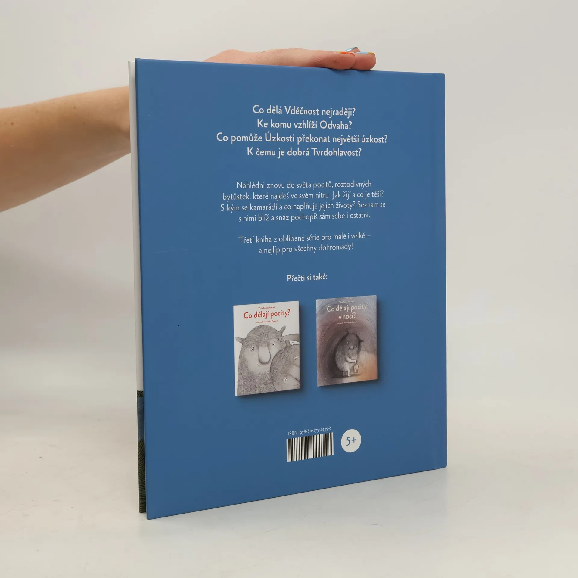 Nahlédněte potřetí do světa pocitů — roztodivných bytůstek žijících v našem nitru. Ve třetí knize úspěšné série se krátké poetické texty z prvního dílu rozvinou do trochu delších, neméně poetických vyprávění, v nichž se dozvíme mnohem víc o tom, jak a čím pocity žijí. Co jetěší, čeho se bojí, co obdivují a s kým se přátelí? Úzkost se kamarádí se Zvědavostí, protože jen ona občas nahlédne pod skříň. A úplně nejspokojenější je, když tam najde plechovku, z níž se ozývají tajemné zvuky. Umíte si představit něco lepšího než nakouknout dovnitř, abyste zjistili, co se tam schovává? Trpělivost vaří marmelády a ze všeho nejraději tráví čas s Klidem. Klid miluje vůni její marmelády. Tvrdohlavost moc baví lepit se na všelijaká úplně nemožná místa a za žádnou cenu se pak nechce odtrhnout. Vděčnost drží v tlapkách hrneček s kakaem a vydává se po chodbách Paměti najít něco, na co by si ráda zavzpomínala. Škodolibost mezitím připravuje další jed a číhá na Štěstí. Pro děti od pěti let.