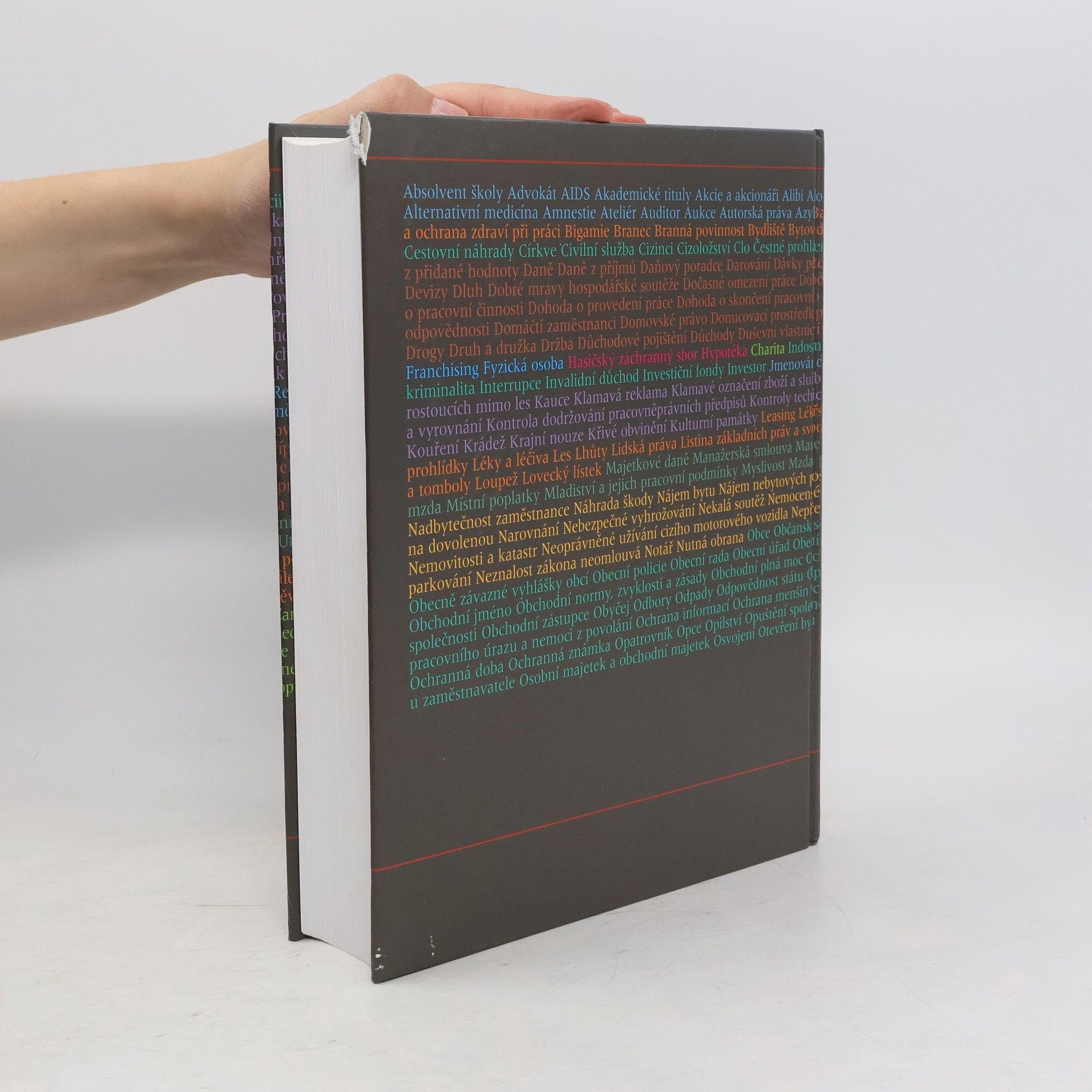 Průvodce bludištěm českých zákonů. Abecedně seřazená hesla v podrobném, leč srozumitelném právnickém objasnění od např. hesla advokát, přes auditor, cestovní náklady, clo, bydliště, DPH, daně, zaměstnání a paragrafy, praconí dohody, fondy, investor, leasing, listina základních práv, lidská práva, poplatky, manažerská smlouva, mzda, náhrada škody, nájem, notář, motorové vozidlo a právo, vyhlášky, policie, úřady obecní správy, obchdoní normy, plná moc, ochrana informací, opatrovník, opce, atd