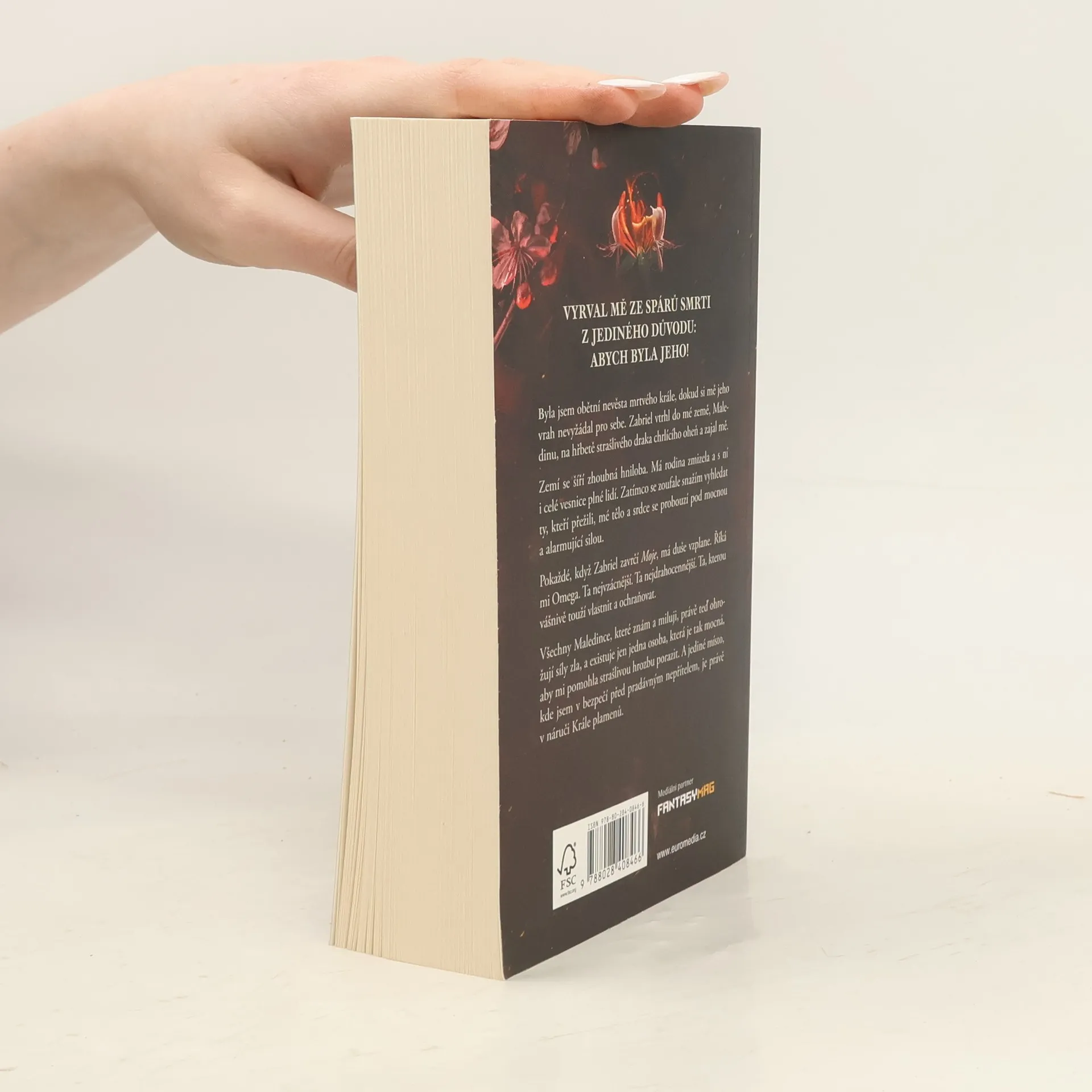 Vyrval mě z čelistí smrti z jednoho důvodu – být jeho. Byla jsem obětní nevěstou mrtvého krále, dokud si mě jeho vrah nepřivlastnil. Zabriel vtrhl do mé země Maledin na hřbetě monstrózního, oheň chrlícího draka a vzal mě do zajetí. Smrtící Zabriel se nade mnou tyčí v ocelovém plátovém brnění a mohl by ze mě snadno rozdrtit život – ale Král plamenů nemá zájem mi ublížit. Místo toho zničí všechny, kteří mi ublížili v bouři ohně a pomsty. Hluboko v mé zemi je zhoubná hniloba. Moje rodina zmizela spolu s celými vesnicemi lidí. Když se zoufale snažím najít ty, kteří chybí, mé tělo a srdce se probouzejí pod mocnou a alarmující silou. Zabriel zapálí mou duši pokaždé, když zavrčí: "Moje." Říká mi Omega. Nejvzácnější. Nejzranitelnější. Ta, kterou touží vlastnit a chránit. Když zlé síly v Maledinu ohrožují každého, koho znám a miluji, existuje jen jedna osoba, která je dostatečně silná, aby mi pomohla je porazit, a jediné místo, kde jsem v bezpečí před prastarým nepřítelem, je v náručí Krále plamenů.