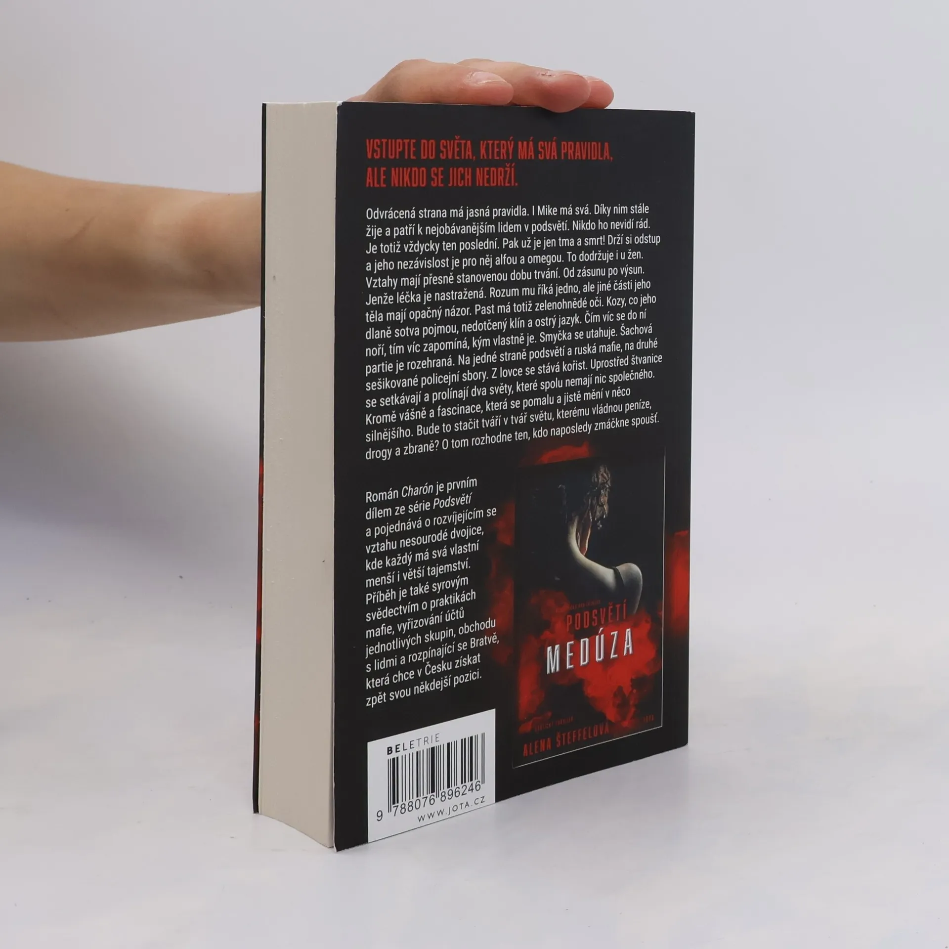 Když si zahráváš s ohněm, můžeš se spálit.Odvrácená strana má jasná pravidla. I Mike má svá. Díky nim stále žije a patří k nejobávanějším lidem v podsvětí. Nikdo ho nevidí rád. Je totiž vždycky ten poslední. Pak už je jen tma a smrt! Drží si odstup a jeho nezávislost je pro něj alfou a omegou. To dodržuje i u žen. Vztahy mají přesně stanovenou dobu trvání. Od zásunu po výsun. Jenže léčka je nastražená. Rozum mu říká jedno, ale jiné části jeho těla mají opačný názor. Past má totiž zelenohnědé oči. Kozy, co jeho dlaně sotva pojmou, nedotčený klín a ostrý jazyk. Čím víc se do ní noří, tím víc zapomíná, kým vlastně je.Smyčka se utahuje. Šachová partie je rozehraná. Na jedné straně podsvětí a ruská mafie, na druhé sešikované policejní sbory. Z lovce se stává kořist. Uprostřed štvanice se setkávají a prolínají dva světy, které spolu nemají nic společného. Kromě vášně a fascinace, která se pomalu a jistě mění v něco silnějšího. Bude to stačit tváří v tvář světu, kterému vládnou peníze, drogy a zbraně? O tom rozhodne ten, kdo naposledy zmáčkne spoušť.Román Charón je první díl série erotických thrillerů z českého podsvětí o rozvíjejícím se vztahu nesourodé dvojice, kde každý má svá menší i větší tajemství. Charón je drsné svědectví o praktikách podsvětí v Česku; syrové vyprávění se strhujícím dějem, nečekanými zápletkami a sarkasmem na každé stránce.Vstupte do světa, který má svá pravidla, ale nikdo se jich nedrží. Vstupte do Podsvětí.