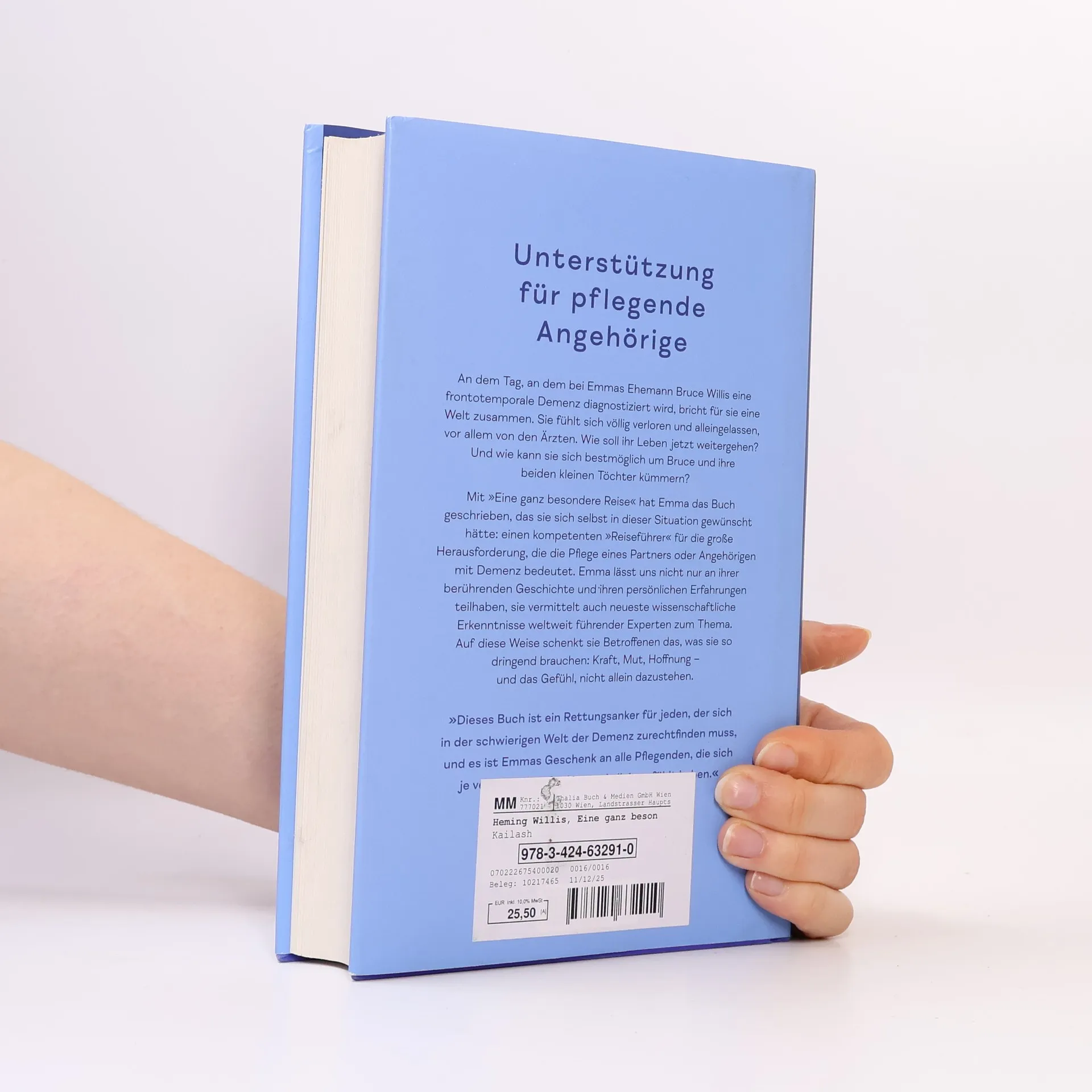 Ein Mut-mach-Buch für alle, die demenzkranke Angehörige begleiten An dem Tag, an dem bei Emmas Ehemann Bruce Willis eine frontotemporale Demenz diagnostiziert wird, bricht für sie eine Welt zusammen. Sie fühlt sich völlig verloren und alleingelassen, vor allem von den Ärzten. Wie soll ihr Leben jetzt weitergehen? Wie kann sie sich bestmöglich um Bruce und gleichzeitig um ihre beiden kleinen Töchter kümmern? Mit „Eine ganz besondere Reise“ hat Emma das Buch geschrieben, das sie sich selbst in dieser Situation gewünscht hätte: einen kompetenten "Reiseführer" für die große Herausforderung, die die Pflege eines Partners oder Angehörigen mit Demenz bedeutet. Dabei lässt sie uns an ihrem eigenen Weg und ihren persönlichen Erfahrungen teilhaben: vom Umgang mit der Diagnose über die Bewältigung von Emotionen bis hin zur nötigen Selbstfürsorge. Zu all diesen Themen sucht sich Emma Rat bei weltweit führenden Experten und lässt diese aktuellen wissenschaftlichen Erkenntnisse in das Buch miteinfließen. Für Emma ist diese "Reise" auch deshalb so "besonders", weil sie eine Transformation erlebt und eine bis dahin nicht gekannte innere Stärke in sich findet. Mit diesem Buch schenkt sie Betroffenen – wie eine beste Freundin – seelischen Beistand und gibt ihnen das, was sie so dringend brauchen: Kraft, Mut, Hoffnung – und das Gefühl, nicht allein dazustehen.