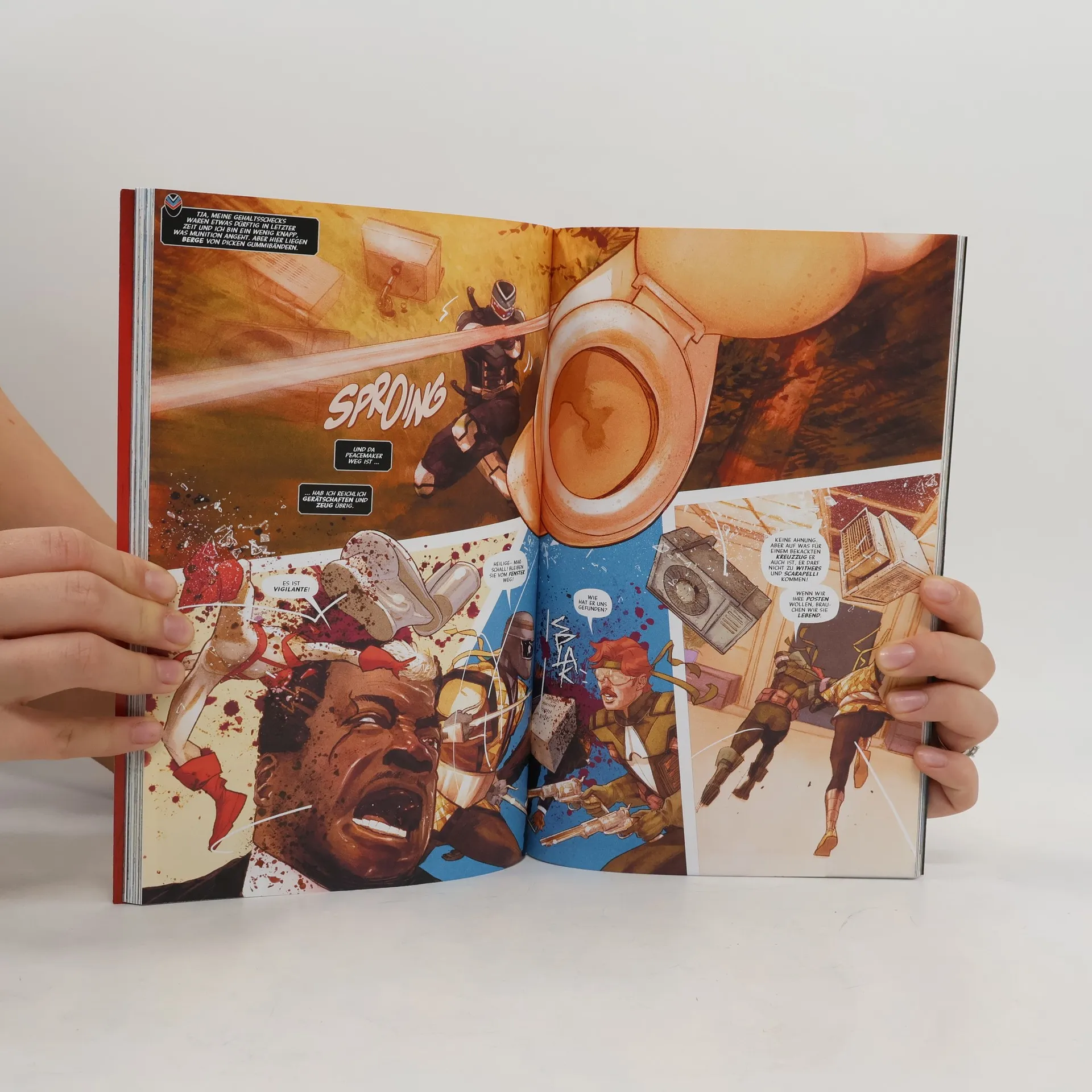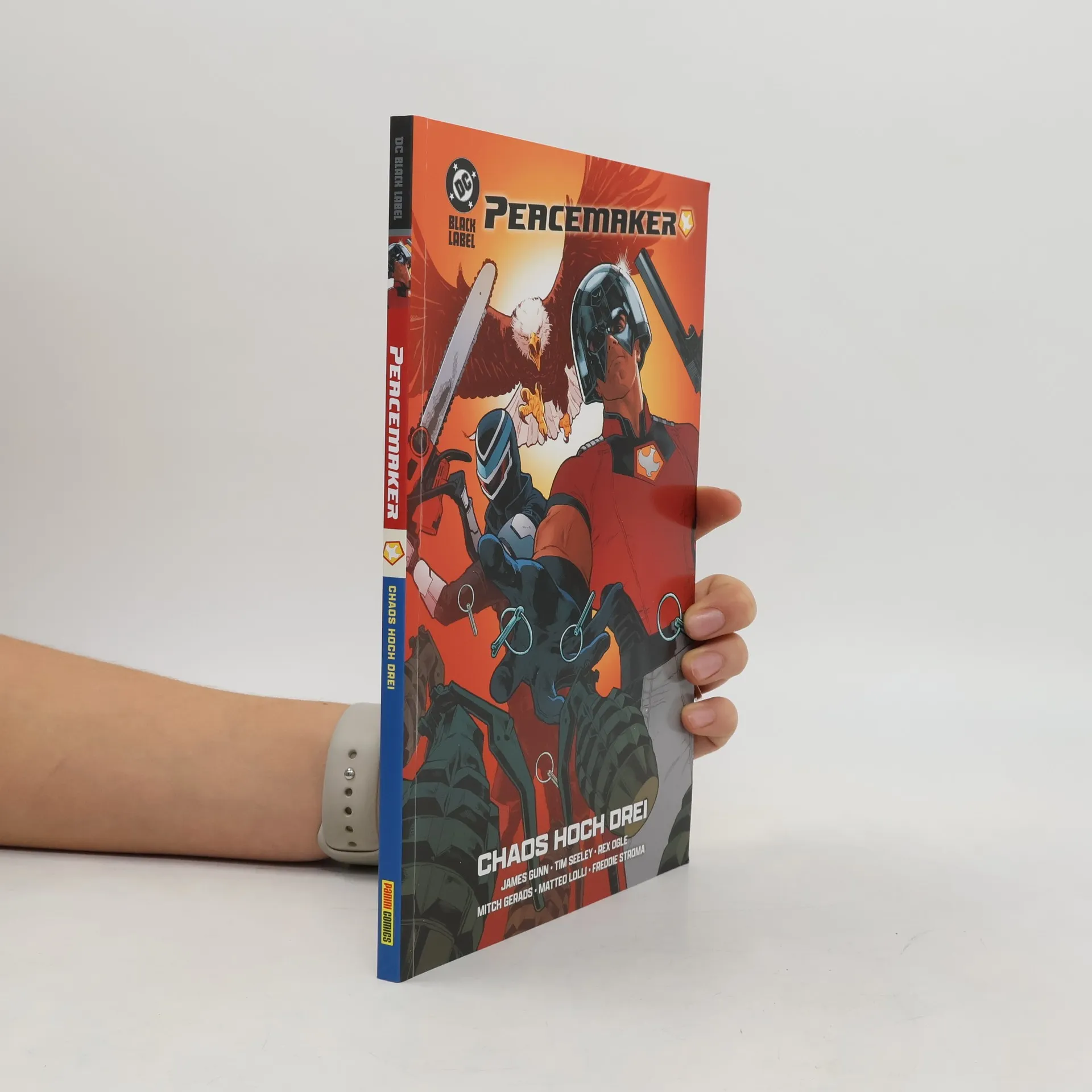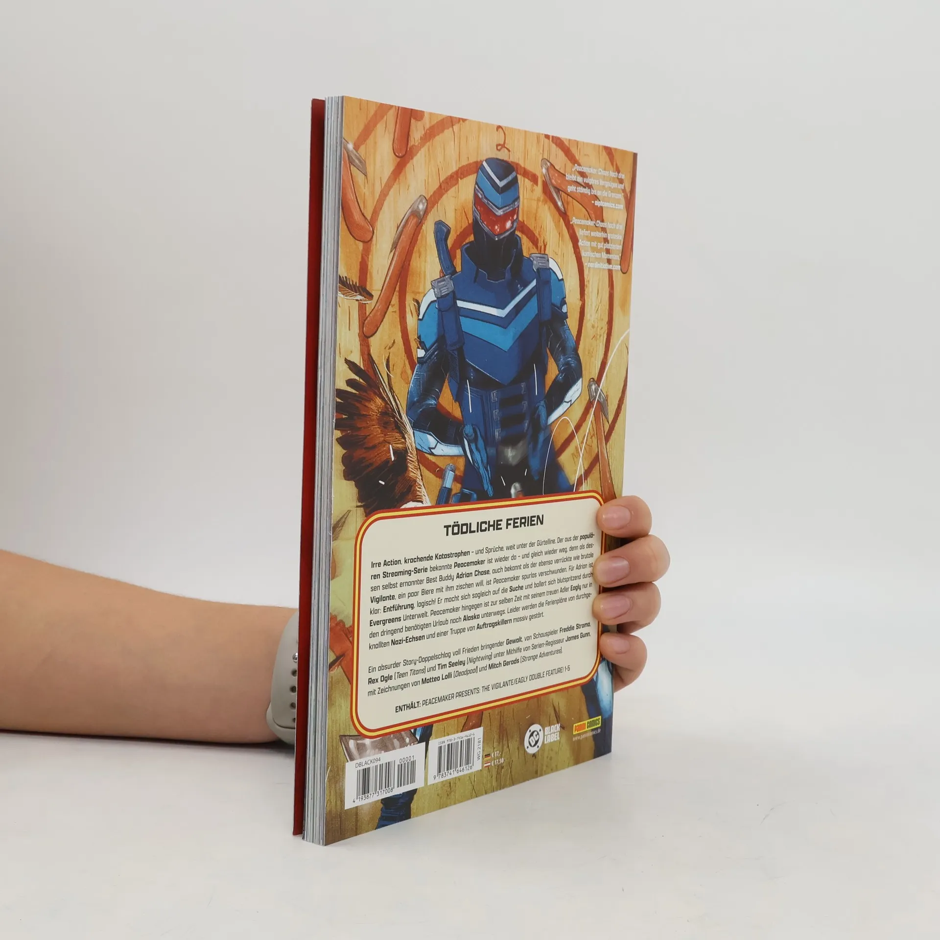 Inspiriert von seiner Peacemaker-Serie war James Gunn der Story-Berater für eine fünfteilige, chaotisch-witzige DC-Miniserie, die jetzt bei Panini erstmals als komplette Softcover-Ausgabe aller erscheint. Zwei Fanlieblinge – Peacemaker und Adrian (Vigilante) – stehen im Mittelpunkt und sorgen für absurde Action und schräge Szenen. Peacemaker blamiert sich, wird verletzt, aber von seinem Adler Eagly gerettet – der Sieg scheint sicher, bis ein möglicher Verrat alles infrage stellt. Adrian kämpft derweil in einer bizarren Szene gegen Schurken – in einer Kondomfabrik. Mit viel schwarzem Humor, übertriebener Action und respektlosem Witz verspricht die Reihe pure Unterhaltung.