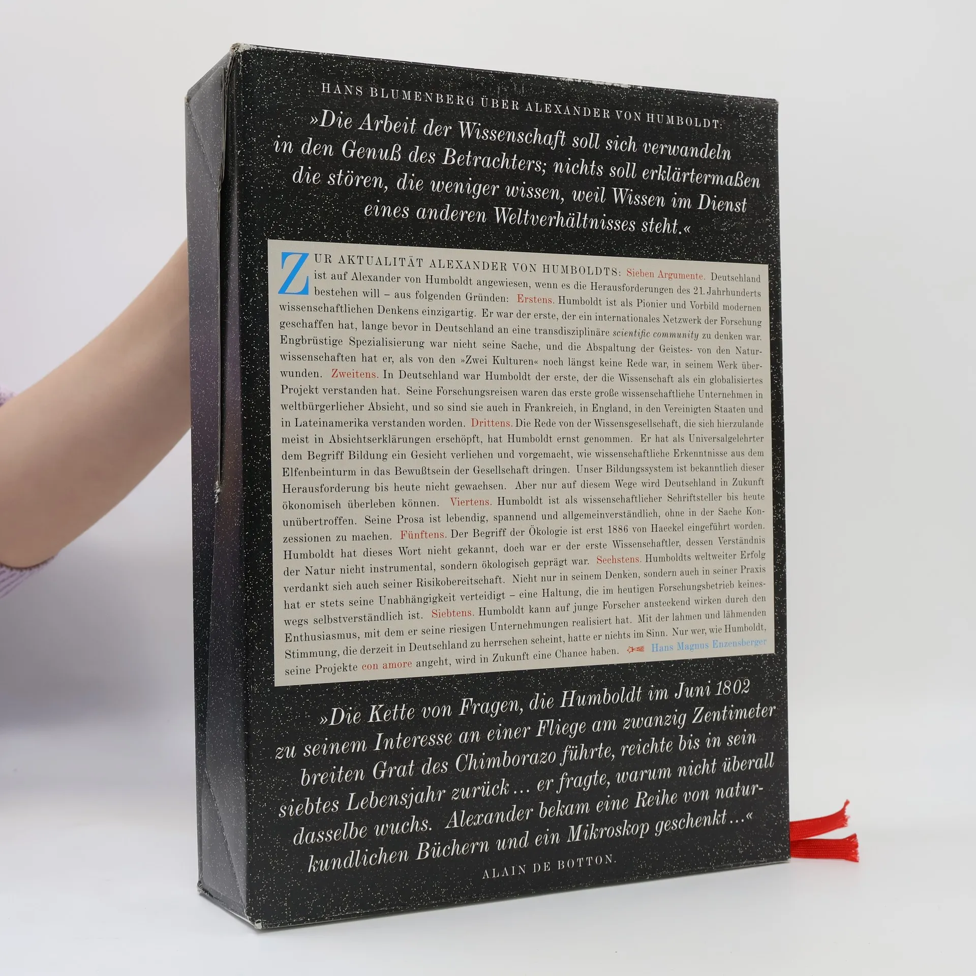 Während die Bibel im Supermarkt verramscht wird, ist Humboldts Gegenentwurf zur Heiligen Schrift in den größten Buchhandlungen kaum zu finden. Humboldts Kosmos gehört zum unverzichtbaren Kanon unserer Zivilisation, und die Zeit ist reif, dieses Werk wieder auf die Tagesordnung zu setzen. Die Bedeutung des Kosmos wird treffend durch Humboldts eigene Worte beschrieben: „Ich fange den Druck meines Werkes (des Werks meines Lebens) an. Ich habe den tollen Einfall, die ganze materielle Welt, alles was wir heute von den Erscheinungen der Himmelsräume, von den Nebelsternen bis zur Geographie der Moose auf den Granitfelsen wissen, alles in Einem Werke darzustellen.“ Der große Naturforscher und Universalgelehrte erzählt von Muschelverkalkungen und Sternschnuppen, von Schwarzen Löchern und der Schönheit der Natur in den Tropen und im Eismeer. Er lehrt uns das Staunen und weckt die Lust, weiter zu fragen: Wie schön wäre es doch, wenn man mehr wüßte. Humboldts populärwissenschaftlichen Kosmos-Vorlesungen lauschte einst halb Berlin – vom Arbeiter bis zur Hofgesellschaft. Die Erstausgabe des Kosmos erschien zwischen 1845 und 1862 in fünf Bänden und erreichte eine Auflage von 80.000, was für damalige Verhältnisse enorm war. Unsere Neuedition berücksichtigt erstmals alle von Humboldt vorgenommenen Korrekturen und Zusätze, wobei die wissenschaftliche Zuverlässigkeit von zwei ausgewiesenen Humboldt-Experten garantiert wird.