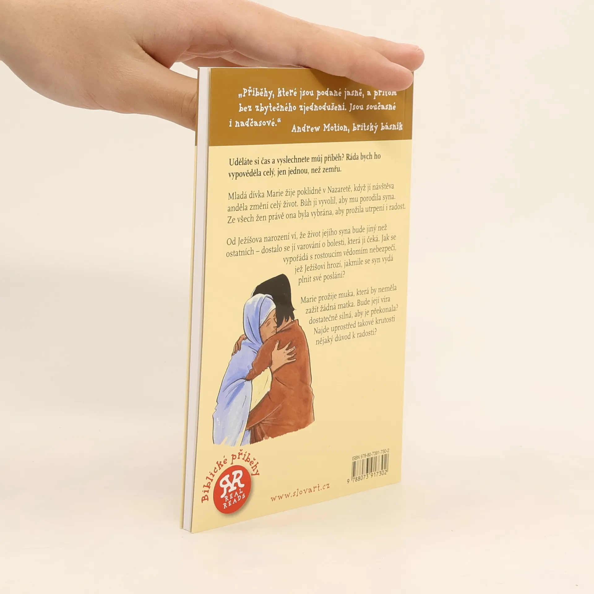 Mladá dívka Marie žije poklidně v Nazaretě, když jí návštěva anděla změní celý život. Bůh ji vyvolil, aby mu porodila syna. Ze všech žen právě ona byla vybrána, aby prožila utrpení i radost. Od Ježíšova narození ví, že život jejího syna bude jiný než ostatních - dostalo se jí varování o bolesti, která ji čeká. Jak se vypořádá s rostoucím vědomím nebezpečí, jež Ježíšovi hrozí, jakmile se syn vydá plnit své poslání? Marie prožije muka, která by neměla zažít žádná matka. Bude její víra dostatečně silná, aby je překonala? Bude mít uprostřed takové krutosti nějaký důvod k radosti? Ilustrovaný příběh pro děti s otázkami na přemýšlení, popřípadě i skupinové aktivity.