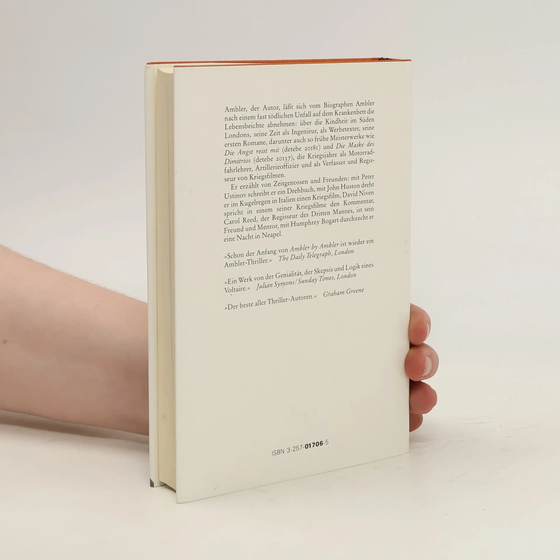 Ambler, der Autor, läßt sich vom Biographen Ambler nach einem fast tödlichen Unfall auf dem Krankenbett die Lebensbeichte abnehmen: über die Kindheit im Süden Londons, seine Zeit als Ingenieur, als Werbetexter, seine ersten Romane, die Kriegsjahre als Motorradfahrlehrer, Artillerieoffizier und als Verfasser und Regisseur von Kriegsfilmen, über Zeitgenossen und Freunde und über vieles mehr.