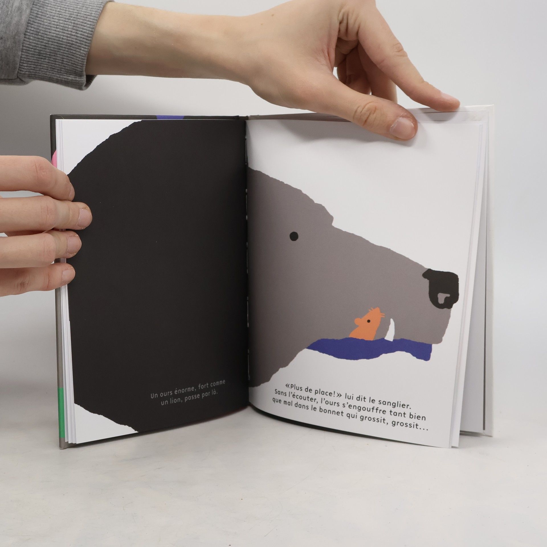 Il fait un froid de canard. Par chance, un bonnet est tombé dans la neige. De quoi se mettre à l'abri ! Une souris s'y faufile, suivie d'une grenouille, une chouette, un lapin, un renard, un sanglier et un ours. « Plus de place ! » s'exclament les animaux au fur et à mesure que le bonnet se remplit. L'arrivée d'une minuscule fourmi fait exploser le bonnet et déclenche la colère des animaux. Dans ce petit album très graphique, Loïc Gaume joue sur les notions de taille, d'accumulation, de disparition, et avec les expressions animalières. Il invite les enfants à s'amuser avec le langage, les formes et les couleurs.
