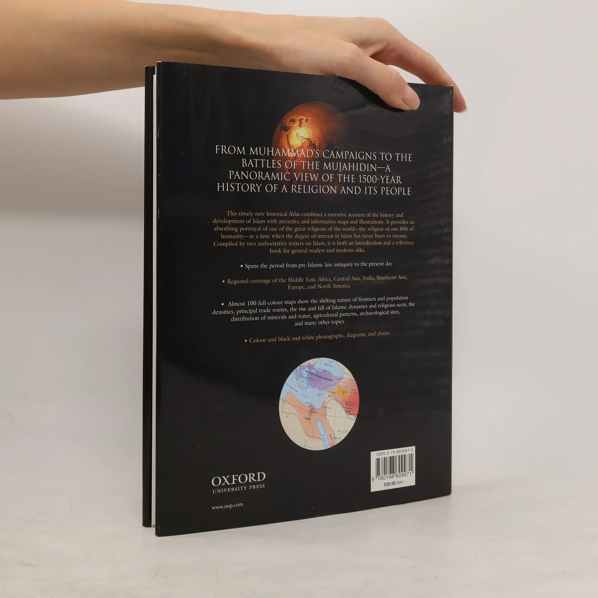 There is significant interest in the Islamic world today, especially following the September 2001 attacks and subsequent wars in Afghanistan and Iraq. Many in the West view 'Islamic Fundamentalism' as a major threat to global peace. While not all scholars agree on a 'Clash of Civilizations' between Islam and the West, the distinct evolution of these cultures is widely acknowledged. A comprehensive understanding of contemporary Islam necessitates a historical perspective. Malise Ruthven, a noted author and commentator on Islam, offers this perspective in a thoroughly researched and well-written format. The Historical Atlas of the Islamic World is concise, accessible, and authoritative, covering the period from pre-Islamic late antiquity to the present, including recent emigration patterns and the independence of post-Soviet Muslim states in Central Asia. The atlas features maps designed to illustrate shifting frontiers and population densities, alongside historical maps of changing boundaries, trade routes, and the rise and fall of dynasties and religious sects. Accompanying essays explore various themes across Muslim-majority regions, addressing topics such as Shari'a, philosophy, architecture, trade, family life, and the impact of European domination and Islamic political movements.