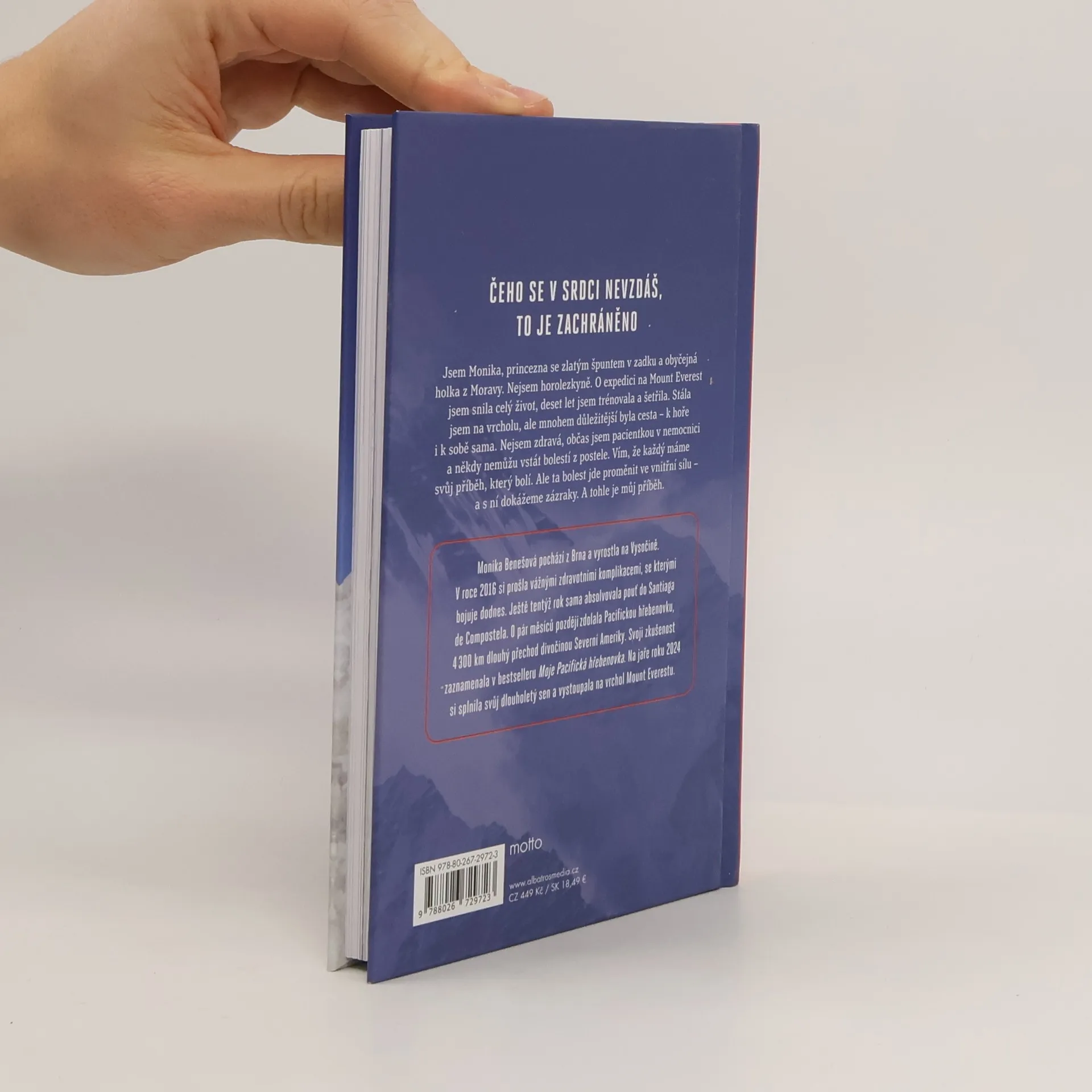 Čeho se v srdci nevzdáš, to je zachráněno Jsem Monika, princezna se zlatým špuntem v zadku a obyčejná holka z Moravy. Nejsem horolezkyně. O expedici na Mount Everest jsem snila celý život, deset let jsem trénovala a šetřila. Stála jsem na vrcholu, ale mnohem důležitější byla cesta – k hoře i k sobě sama. Nejsem zdravá, občas jsem pacientkou v nemocnici a někdy nemůžu vstát bolestí z postele. Vím, že každý máme svůj příběh, který bolí. Ale ta bolest jde proměnit ve vnitřní sílu – a s ní dokážeme zázraky. A tohle je můj příběh.