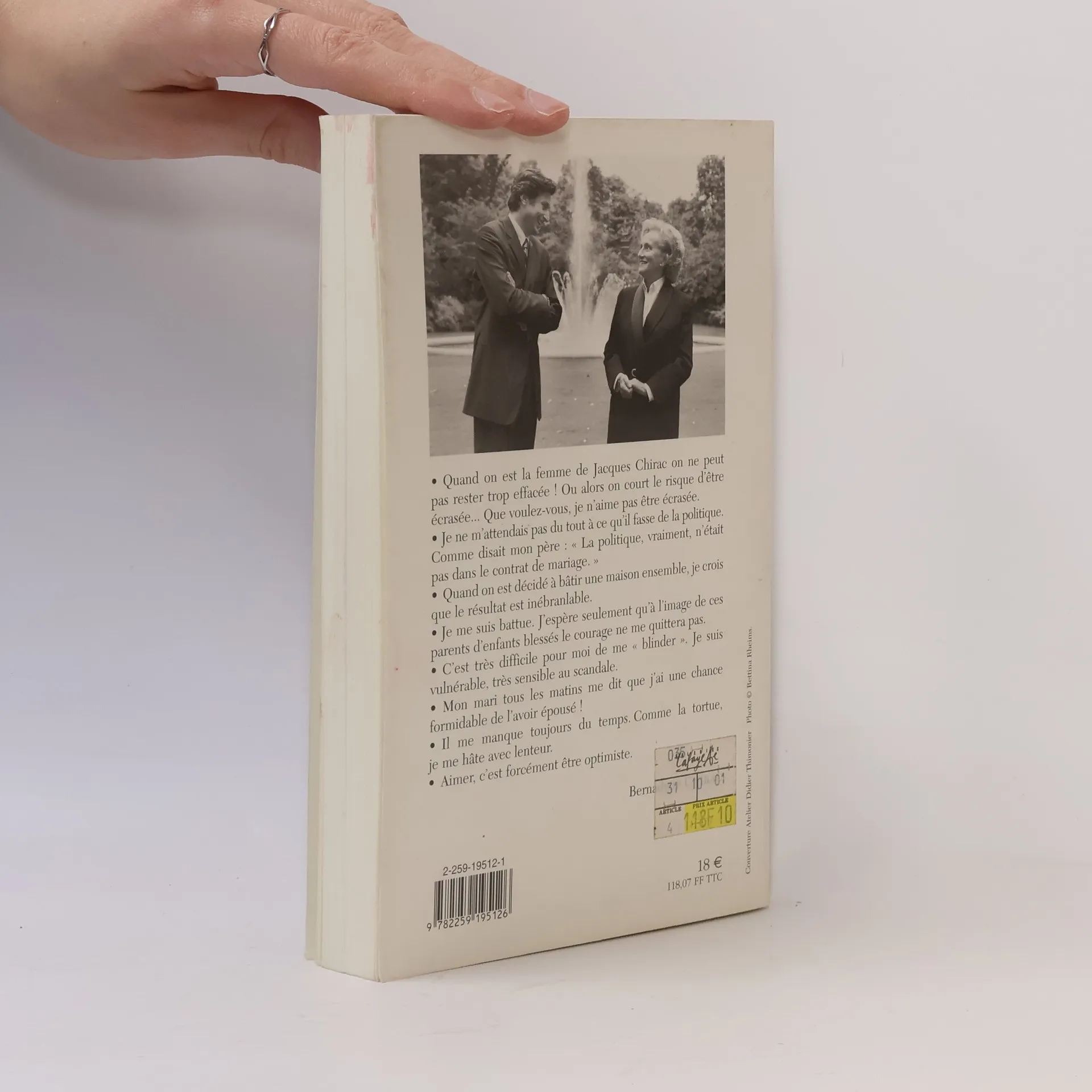 La première dame de France, épouse du Président Chirac, nous invite à assister à une Conversation intime et captivante. Elle nous parle d'elle, de lui, mais surtout de nous. "Quand on est la femme de Jacques Chirac on ne peut pas rester trop effacée ! Ou alors on court le risque d'être écrasée... Que voulez-vous, je n'aime pas être écrasée. Je ne m'attendais pas du tout à ce qu'il fasse de la politique. Comme disait mon père : "La politique, vraiment, n'était pas dans le contrat de mariage." Quand on est décidé à bâtir une maison ensemble, je crois que le résultat est inébranlable. Je me suis battue. J'espère seulement qu'à l'image de ces parents d'enfants blessés le courage ne me quittera pas. C'est très difficile pour moi de me "blinder". Je suis vulnérable, très sensible au scandale. Mon mari tous les matins me dit que j'ai une chance formidable de l'avoir épousé ! Il me manque toujours du temps. Comme la tortue, je me hâte avec lenteur. Aimer, c'est forcément être optimiste."Bernadette Chirac
