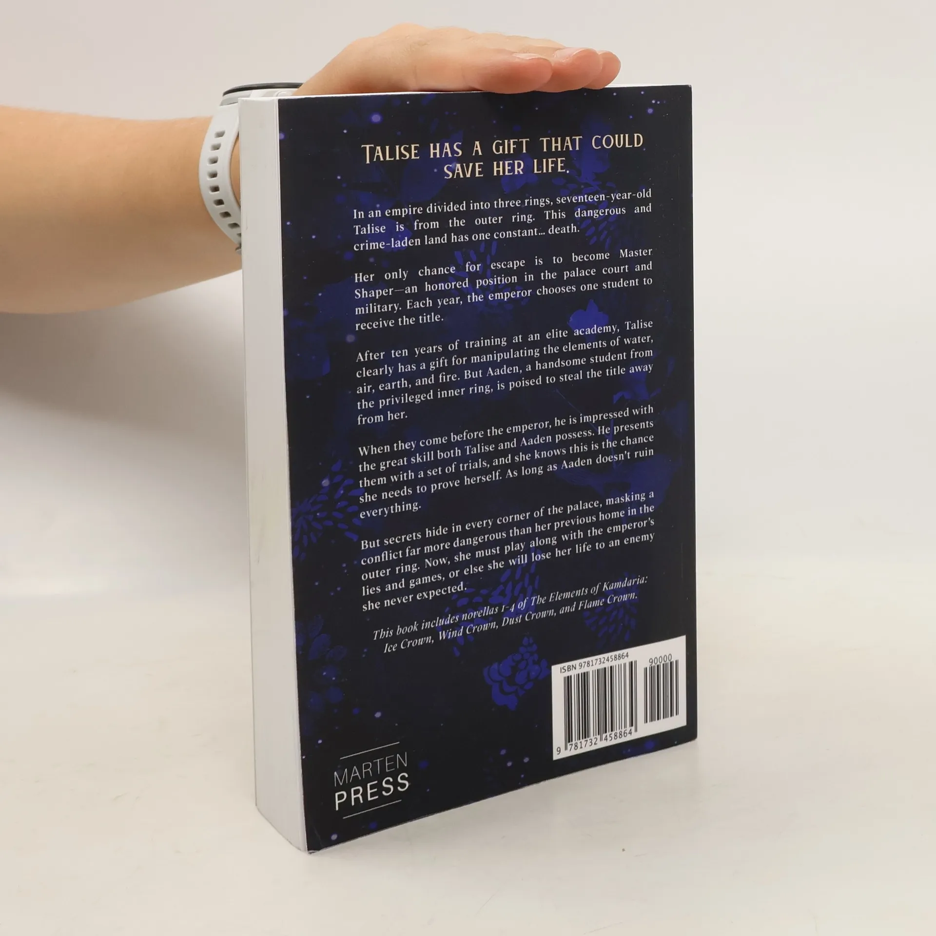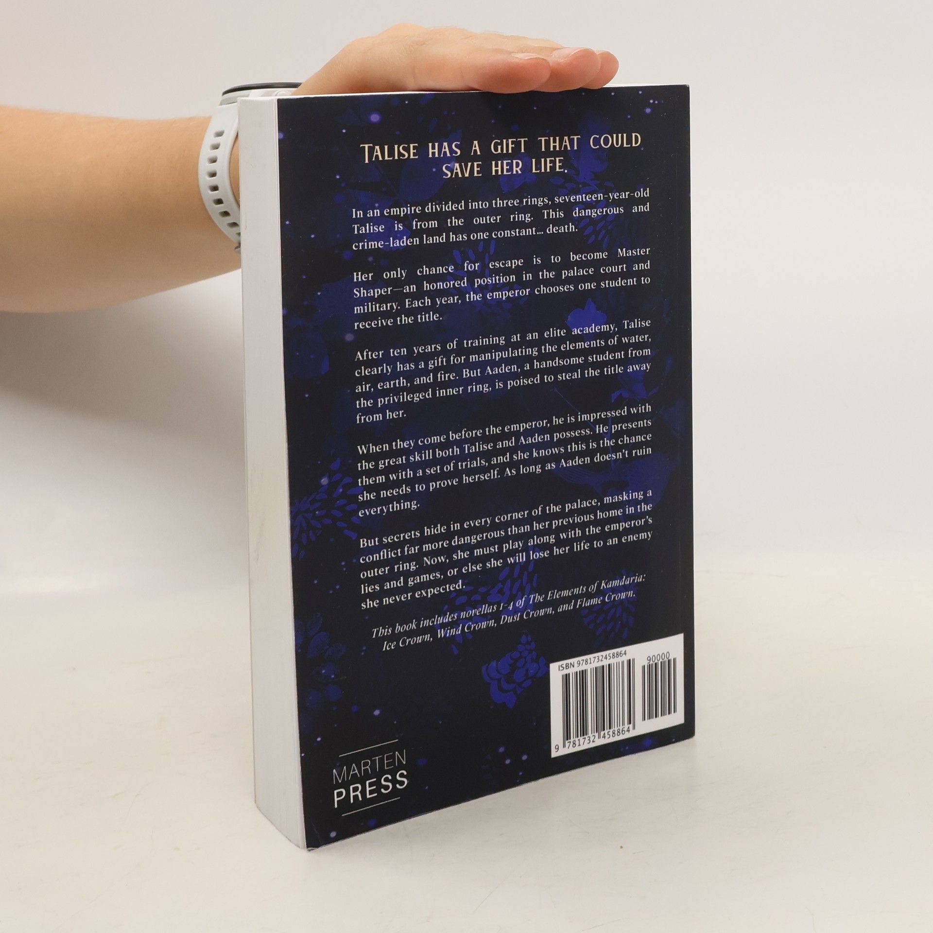 Talise has a gift that could save her life. In an empire divided into three rings, seventeen-year-old Talise is from the outer ring. This dangerous and crime-laden land has one constant... death. Her only chance for escape is to become Master Shaper--an honored position in the palace court and military. Each year, the emperor chooses one student to receive the title. After ten years of training at an elite academy, Talise clearly has a gift for manipulating the elements of water, air, earth, and fire. But Aaden, a handsome student from the privileged inner ring, is poised to steal the title away from her. When they come before the emperor, he is impressed with the great skill both Talise and Aaden possess. He presents them with a set of trials, and she knows this is the chance she needs to prove herself. As long as Aaden doesn't ruin everything. But secrets hide in every corner of the palace, masking a conflict far more dangerous than her previous home in the outer ring. Now, she must play along with the emperor's lies and games, or else she will lose her life to an enemy she never expected. This book includes novellas 1-4 of The Elements of Kamdaria: Ice Crown, Wind Crown, Dust Crown, and Flame Crown.