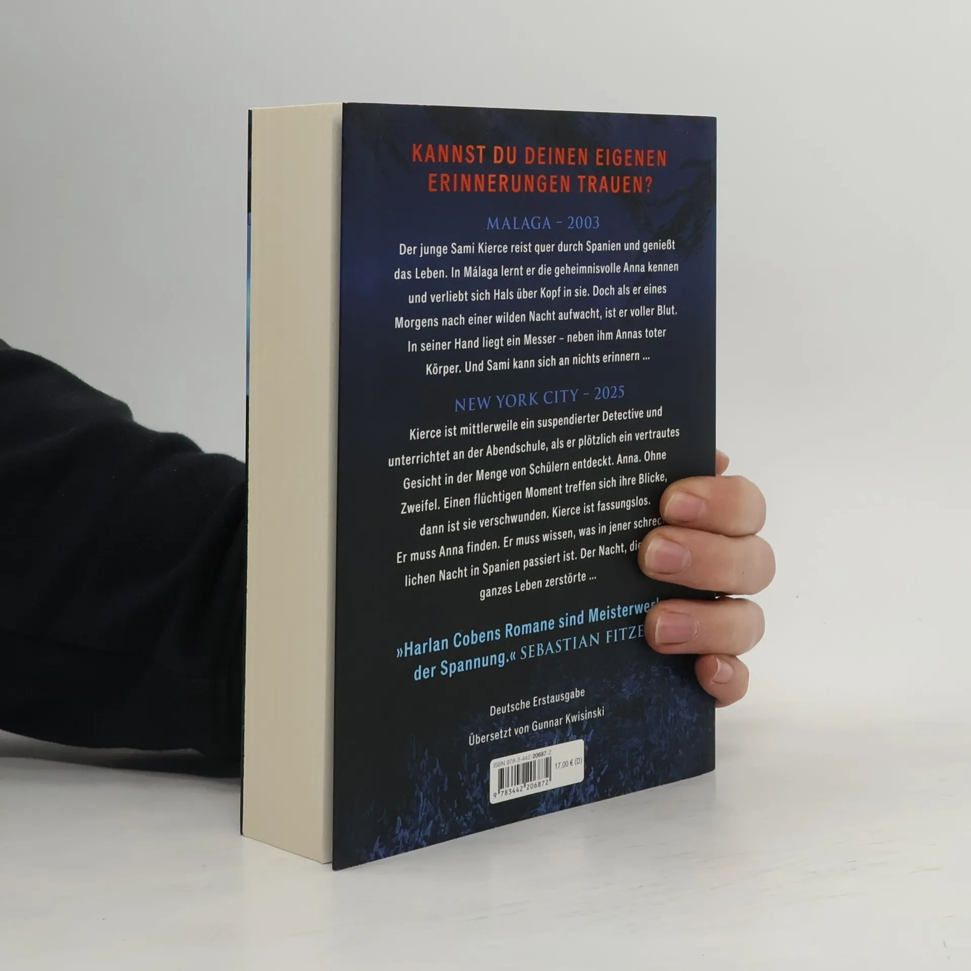 MALAGA – 2003 Der junge Sami Kierce reist quer durch Spanien und genießt das Leben. In Malaga lernt er die geheimnisvolle Anna kennen und verliebt sich Hals über Kopf in sie. Doch als er eines Morgens nach einer wilden Nacht aufwacht, ist er voller Blut. In seiner Hand liegt ein Messer – neben ihm Annas toter Körper. Und Sami kann sich an nichts erinnern … NEW YORK CITY – 2025 Kierce ist mittlerweile ein suspendierte Detective und unterrichtet an der Abendschule, als er plötzlich ein vertrautes Gesicht in der Menge von Schülern entdeckt. Anna. Ohne Zweifel. Einen flüchtigen Moment treffen sich ihre Blicke, dann ist sie verschwunden. Kierce ist fassungslos. Er muss Anna finden. Er muss wissen, was in jener schrecklichen Nacht in Spanien passiert ist. Die Nacht, die sein ganzes Leben zerstörte …