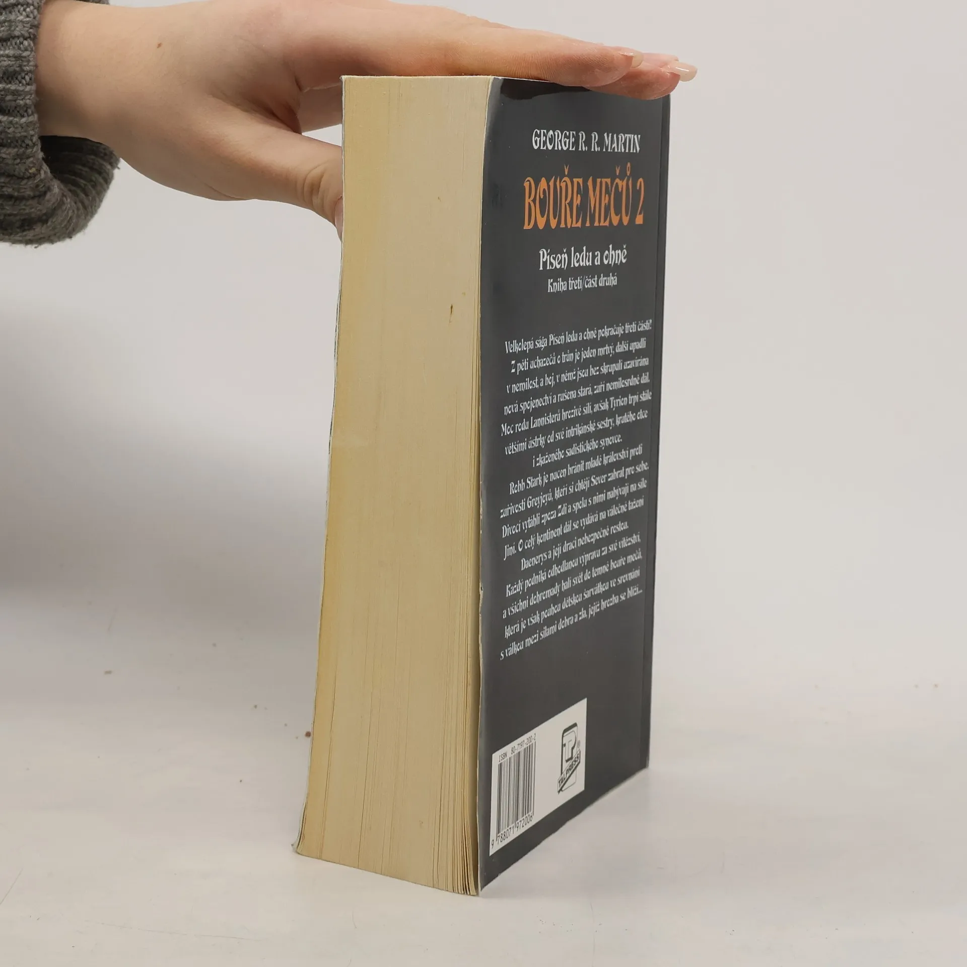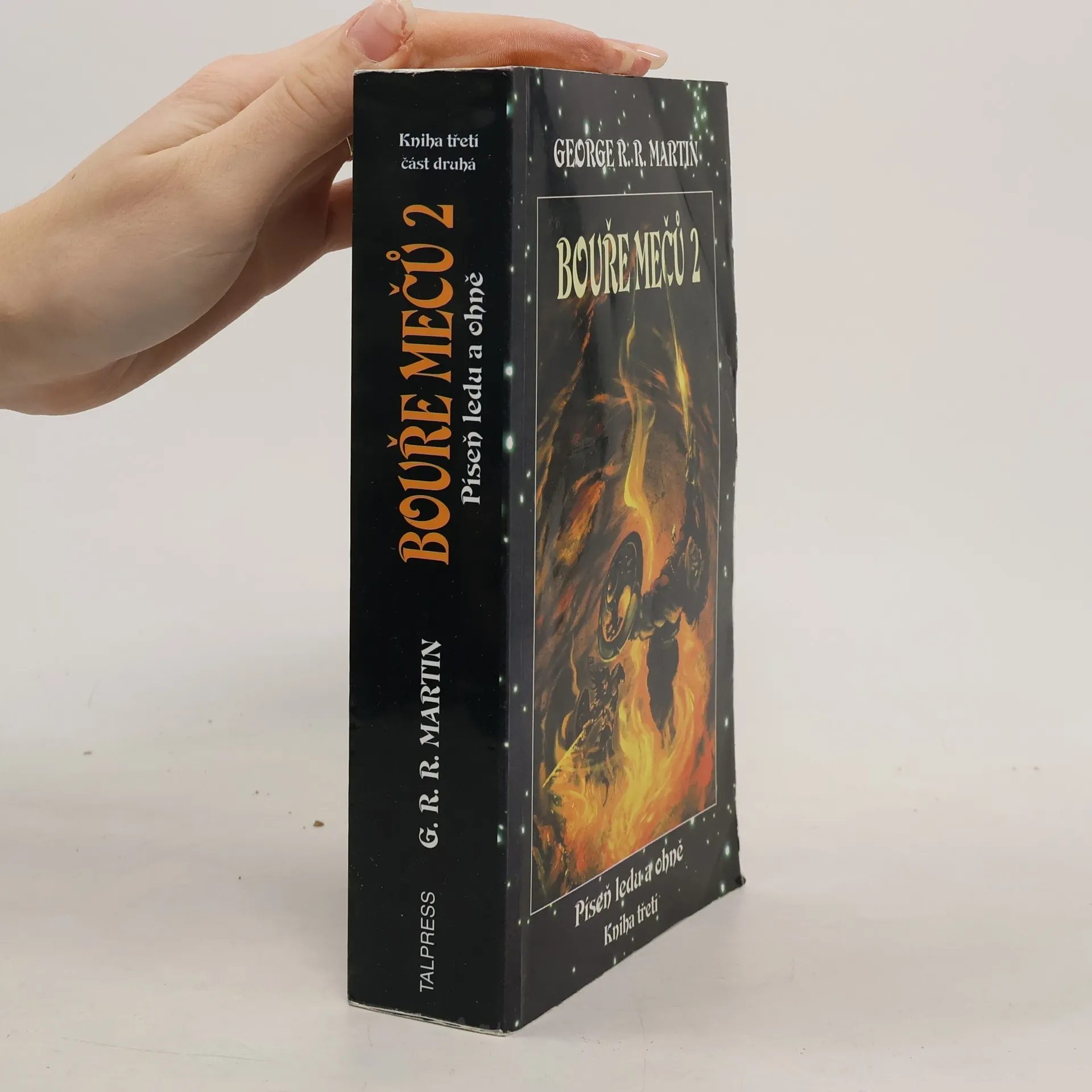 3. kniha série Píseň ledu a ohně – část 2. Z pěti uchazečů o trůn je jeden mrtvý, další upadli v nemilost, a boj, v němž jsou bez skrupulí uzavírána nová spojenectví a rušena stará, zuří nemilosrdně dál. Moc rodu Lannisterů hrozivě sílí, avšak Tyrion trpí stále většími ústrky od své intrikánské sestry, krutého otce i zkaženého sadistického synovce. Robb Stark je nucen bránit mladé království proti zuřivosti Greyjoyů, kteří si chtějí Sever zabrat pro sebe. Divocí vytáhli zpoza Zdi a spolu s nimi nabývají na síle Jiní. O celý kontinent dál se vydává na válečné tažení Daenerys a její draci nebezpečně rostou.Každý podniká odhodlanou výpravu za své vítězství, a všichni dohromady halí svět do temné bouře mečů, která je však pouhou dětskou šarvátkou ve srovnání s válkou mezi silami dobra a zla, jejíž hrozba se blíží… První vydání. (zdroj: legie.info)