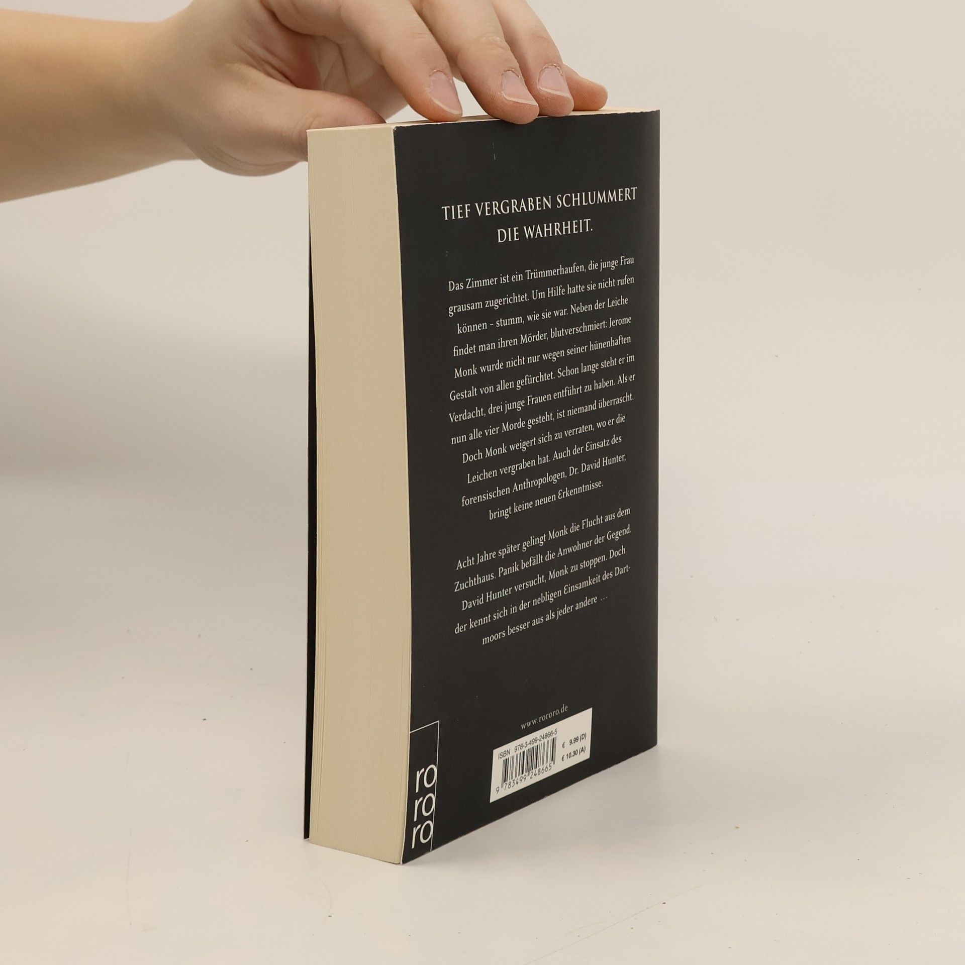 Tief vergraben schlummert die Wahrheit. Das Zimmer ist ein Trümmerhaufen, die junge Frau grausam zugerichtet. Neben der Leiche findet man den Mörder, blutverschmiert: Schon lange steht Jerome Monk im Verdacht, drei junge Frauen getötet zu haben. Als er nun alle vier Morde gesteht, ist niemand überrascht. Doch Monk weigert sich zu verraten, wo er die Leichen vergraben hat. Auch der Einsatz des forensischen Anthropologen, Dr. David Hunter, bringt keine neuen Erkenntnisse. Acht Jahre später gelingt Monk die Flucht aus dem Zuchthaus. Panik befällt die Anwohner der Gegend. David Hunter versucht, Monk zu stoppen. Doch der kennt sich in der nebligen Einsamkeit des Dartmoor besser aus als jeder andere ...