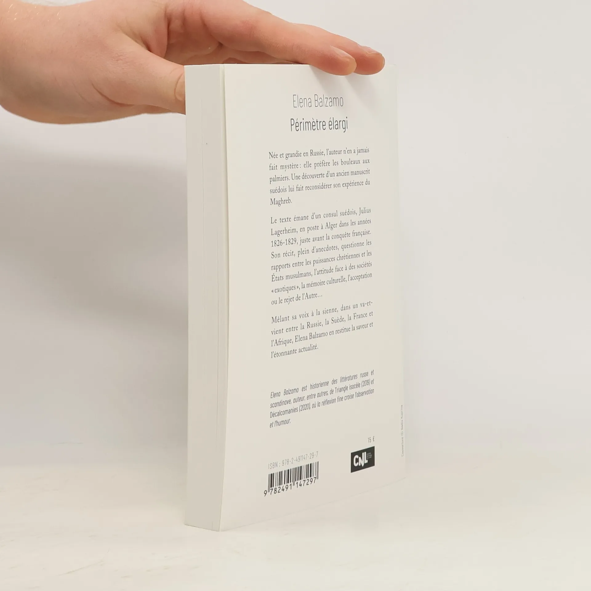 Périmètre élargi . Née et grandie en Russie, l'auteur n'en a jamais fait mystère : elle préfère les bouleaux aux palmiers. Une découverte d'un ancien manuscrit suédois lui fait reconsidérer son expérience du Maghreb.. Le texte émane d'un consul suédois, Julius Lagerheim, en poste à Alger dans les années 1826-1829, juste avant la conquête française. Son récit, plein d'anecdotes, questionne les rapports entre les puissances chrétiennes et les Etats musulmans, l'attitude face à des sociétés « exotiques », la mémoire culturelle, l'acceptation ou le rejet de l'Autre.... Mêlant sa voix à la sienne, dans un va-et- vient entre la Russie, la Suède, la France et l'Afrique, Elena Balzamo en restitue la saveur et l'étonnante actualité..