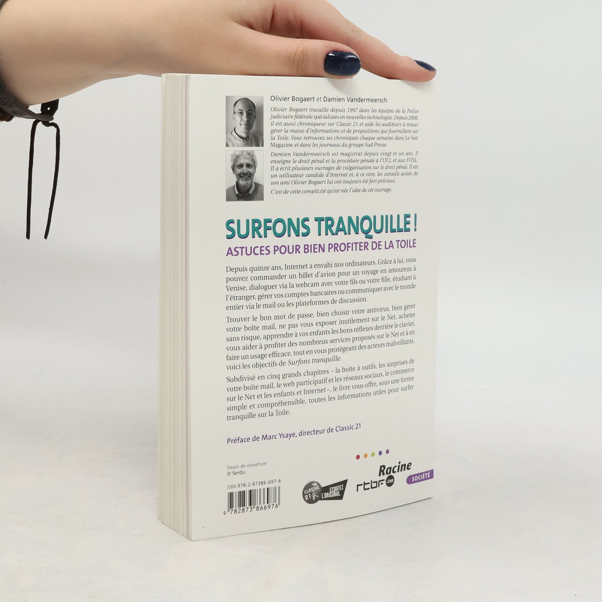 Depuis quinze ans, Internet a envahi nos ordinateurs. Grâce à lui, vous pouvez commander un billet d'avion pour un voyage en amoureux à Venise, dialoguer via la webcam avec votre fils ou votre fille, étudiant à l'étranger, gérer vos comptes bancaires ou communiquer avec le monde entier via le mail ou les plateformes de discussion. Trouver le bon mot de passe, bien choisir votre antivirus, bien gérer votre boîte mail, ne pas vous exposer inutilement sur le Net, acheter sans risque, apprendre à vos enfants les bons réflexes derrière le clavier, vous aider à profiter des nombreux services proposés sur le Net et à en faire un usage efficace, tout en vous protégeant des acteurs malveillants, voici les objectifs de Surfons tranquille. Subdivisé en cinq grands chapitres, la boîte à outils, les surprises de votre boîte mail, le web participatif et les réseaux sociaux, le commerce sur le Net et les enfants et Internet, le livre vous offre, sous une forme simple et compréhensible, toutes les informations utiles pour surfer tranquille sur la Toile.